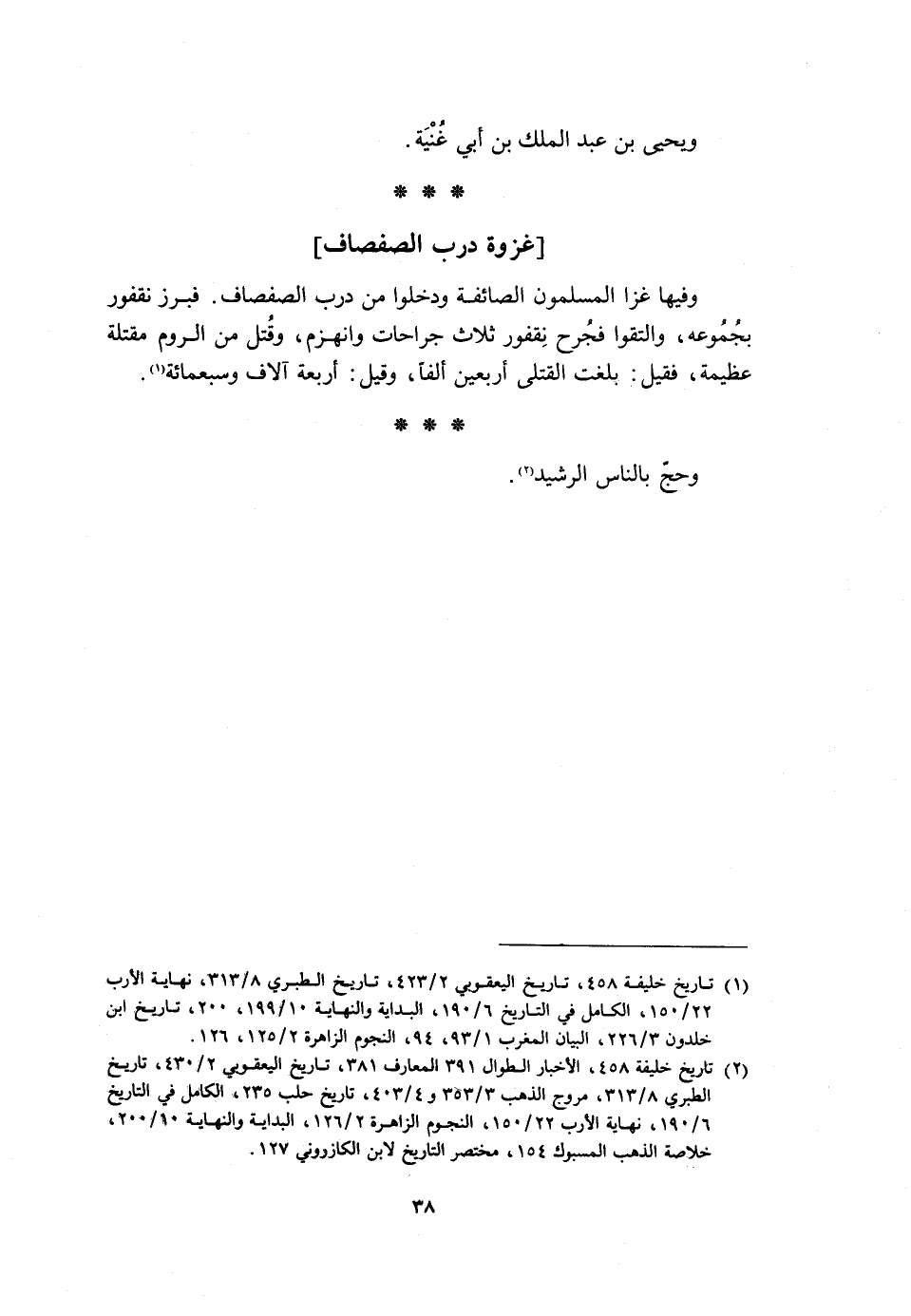 وَفِيهَا غَزَا الْمُسْلِمُونَ الصَّائِفَةَ وَدَخَلُوا مِنْ دَرْبِ الصَّفْصَافِ. فَبَرَزَ نِقْفُورُ بِجُمُوعِهِ، وَالْتَقَوْا فَجُرِحَ نِقْفُورُ ثَلاثَ جِرَاحَاتٍ وَانْهَزَمَ، وَقُتِلَ مِنَ الرُّومِ مَقْتَلَةٌ عَظِيمَةٌ، فَقِيلَ: بَلَغَتِ الْقَتْلَى أَرْبَعِينَ أَلْفًا، وَقِيلَ: أَرْبَعَةَ آلافٍ وَسَبْعَمِائَةٍ [1] .