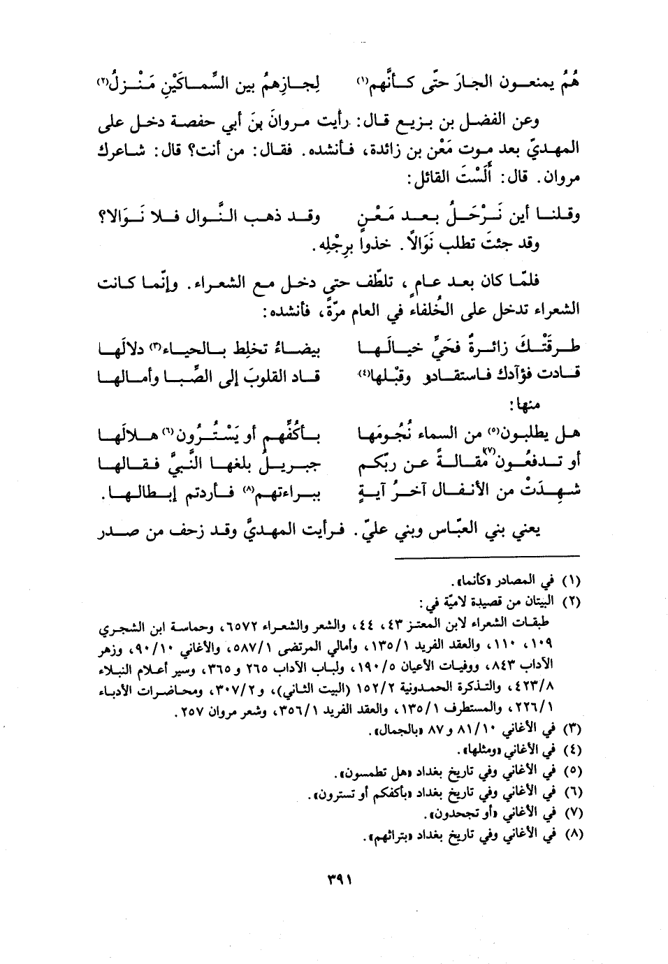 وعن الفضل بن بزيع قال: رأيت مروان بن أبي حفصه دخل على المهديّ بعد موت مَعْن بن زائدة، فأنشده. فقال: من أنت؟ قال: شاعرك مروان. قال: ألست القائل: