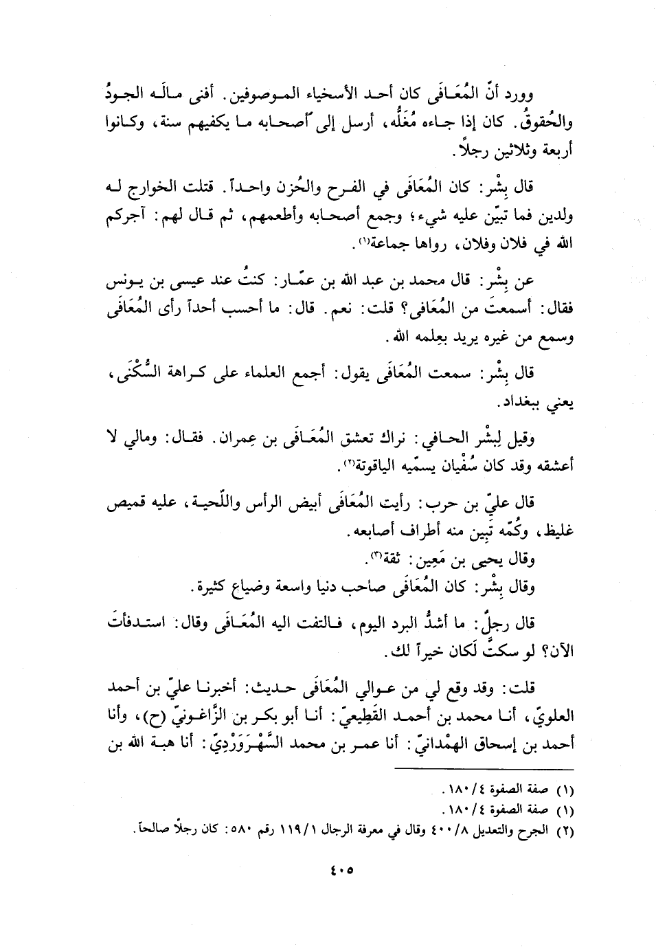 قال عليّ بن حرب: رأيت الْمُعَافَى أبيض الرأس واللّحية، عليه قميص غليظ، وكُمّه تَبِين منه أطراف أصابعه.
