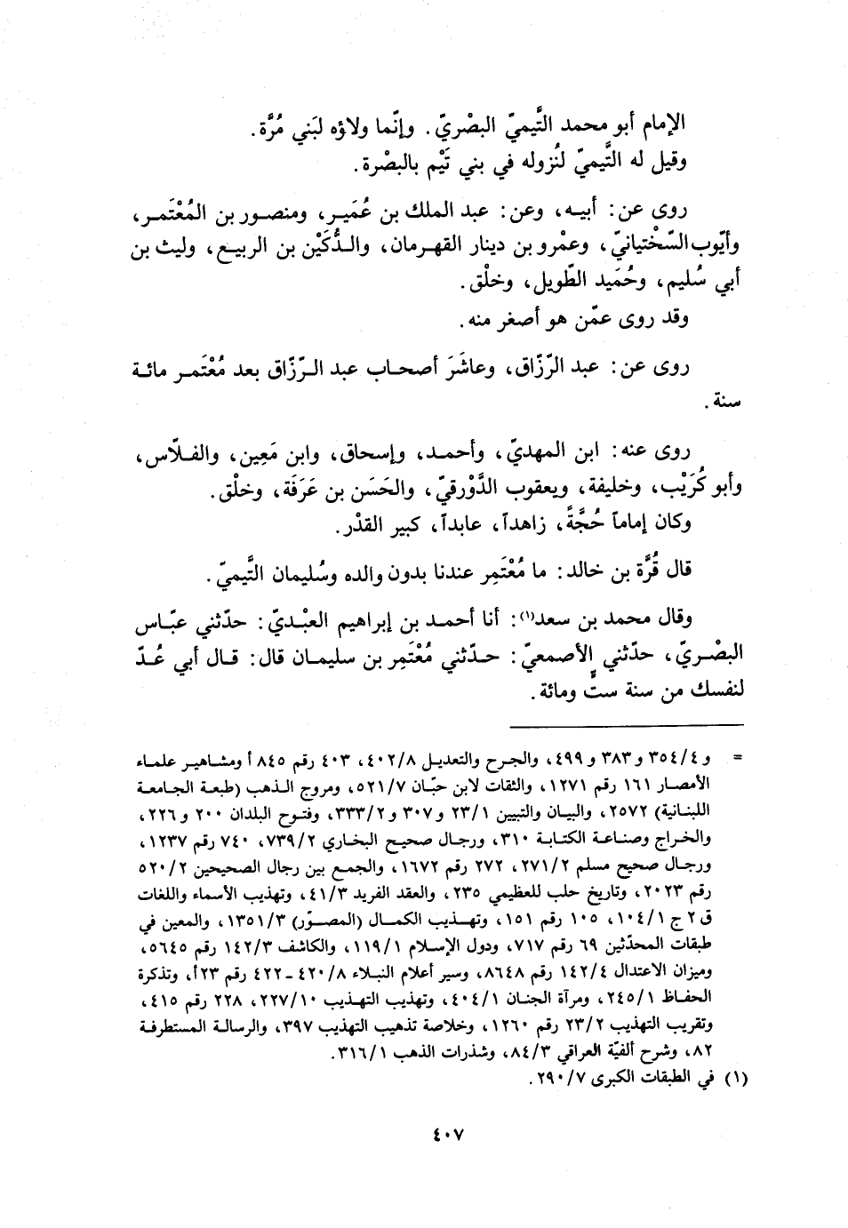 قال قُرَّةُ بن خالد: ما مُعْتَمِر عندنا بدون والده وسُليمان التّيميّ.