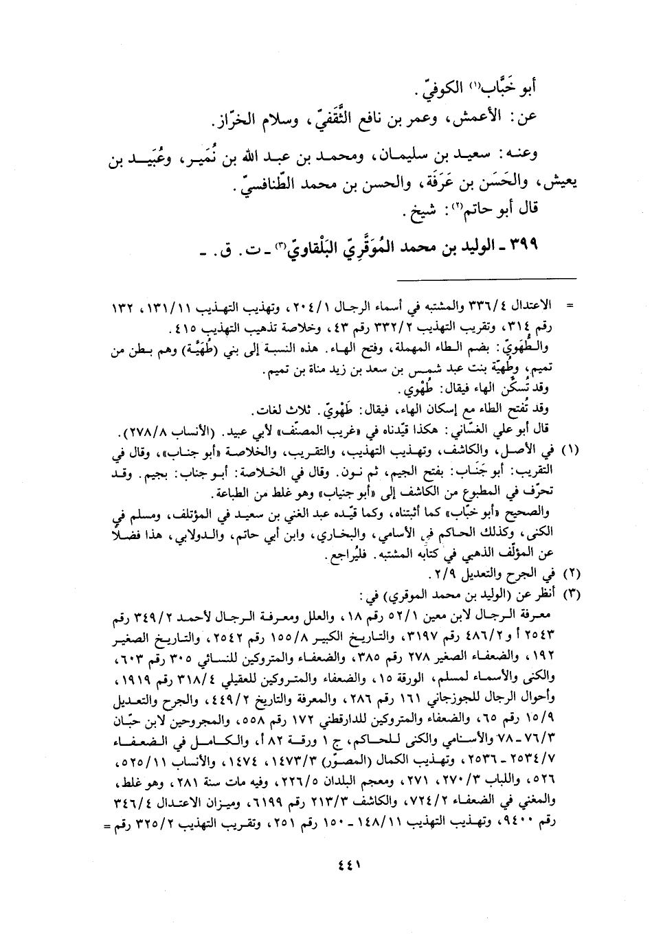 [ (-) ] الاعتدال 4/ 336 والمشتبه في أسماء الرجال 1/ 204، وتهذيب التهذيب 11/ 131، 132 رقم 314، وتقريب التهذيب 2/ 332 رقم 43، وخلاصة تذهيب التهذيب 415.