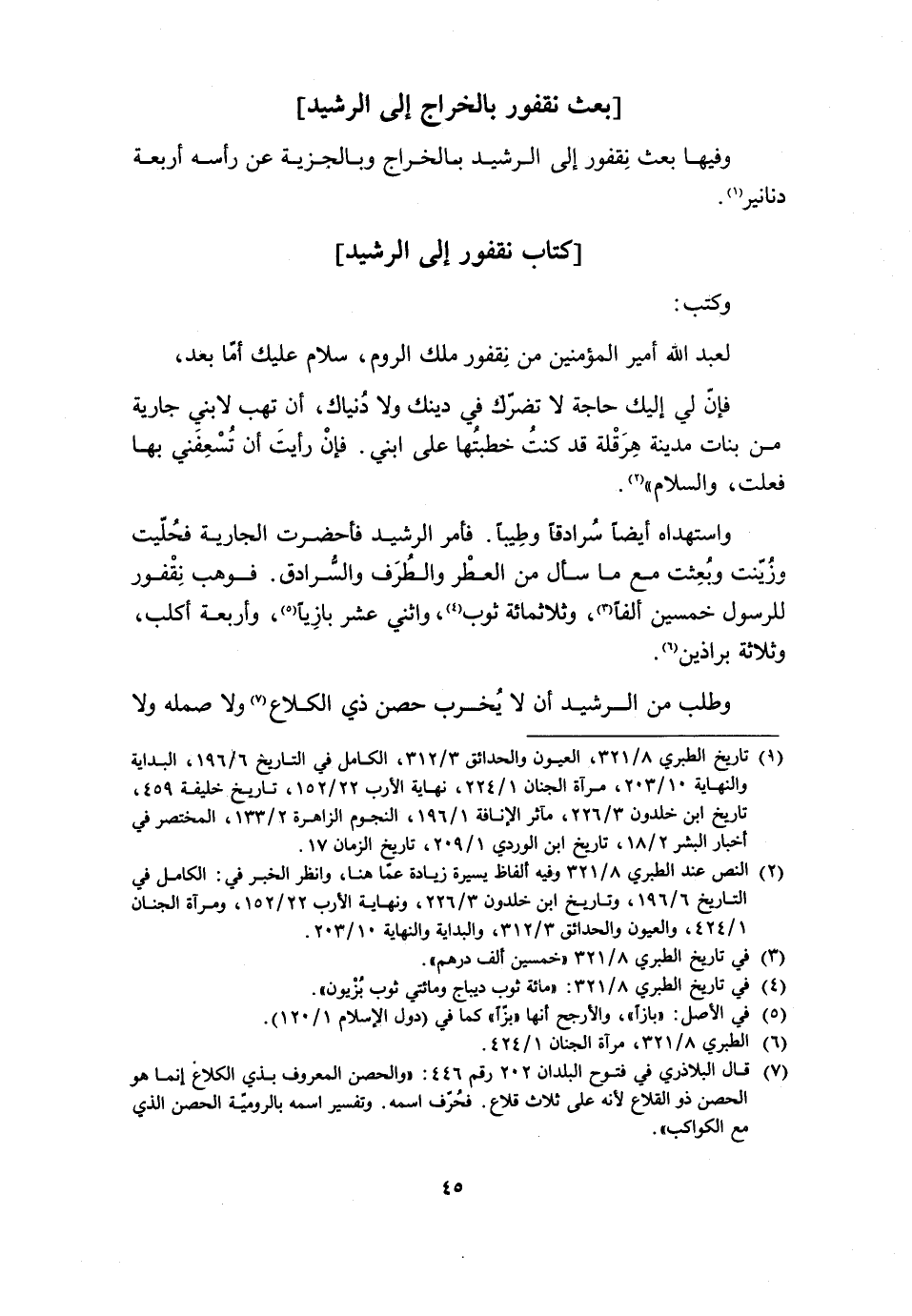 لِعَبْدِ اللَّهِ أَمِيرِ الْمُؤْمِنِينَ مِنْ نِقْفُورَ مَلِكِ الرُّومِ، سَلامٌ عَلَيْكَ أَمَّا بَعْدُ، فَإِنَّ لِي إِلَيْكَ حَاجَةً لا تَضُرُّكَ فِي دِينِكَ وَلا دُنياك، أَنْ تَهَبَ لابْنِي جَارِيَةً مِنْ بَنَاتِ مَدِينَةِ هِرَقْلَةَ قَدْ كُنْتُ خَطَبْتُهَا عَلَى ابْنِي. فَإِنْ رَأَيْتَ أَنْ تُسْعِفَنِي بِهَا فَعَلْتَ، وَالسَّلامُ» [2] .