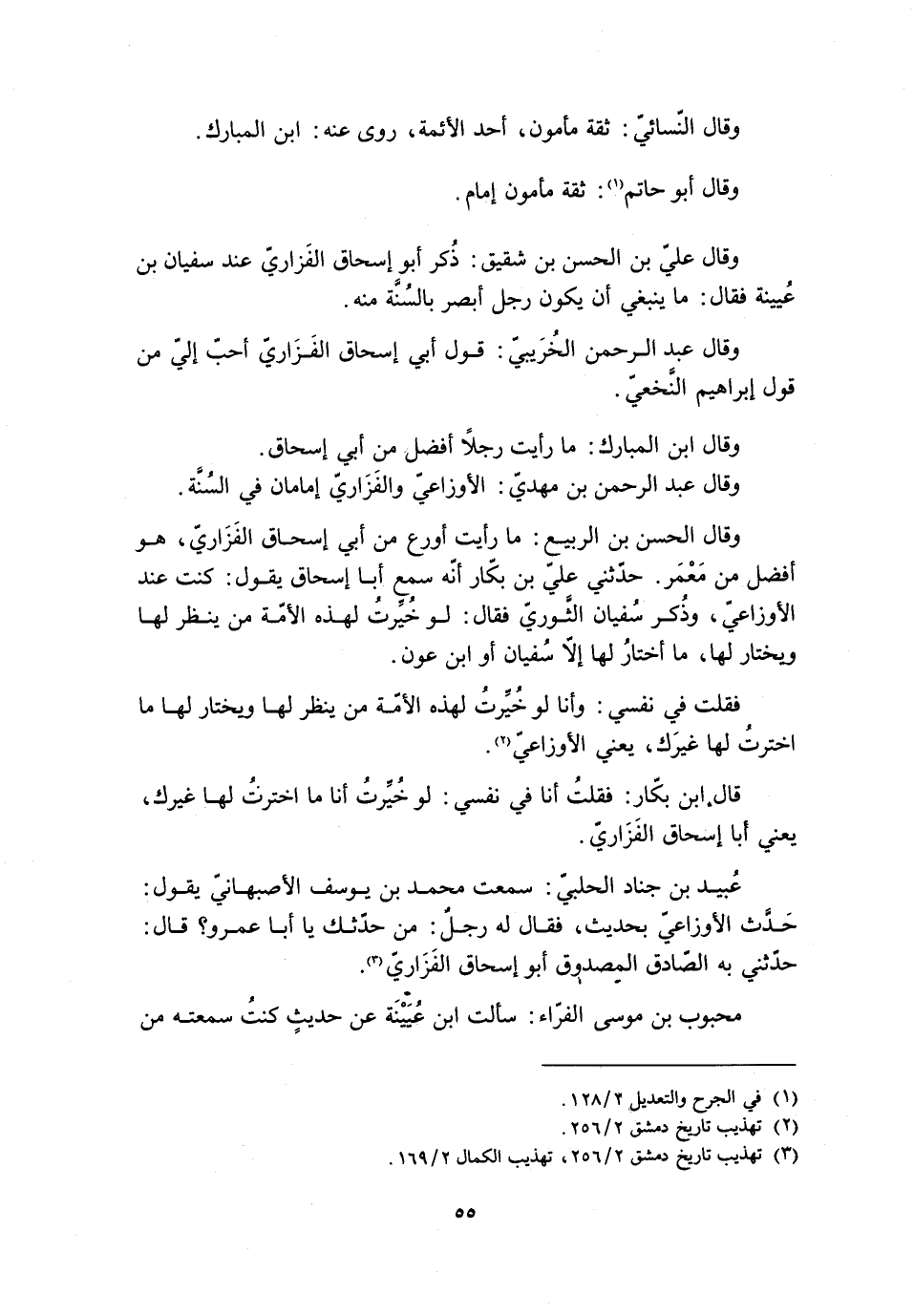 وَقَالَ عَبْدُ الرَّحْمَنِ بْنُ مَهْدِيٍّ: الأَوْزَاعِيُّ وَالْفَزَارِيُّ إِمَامَانِ فِي السُّنَّةِ.