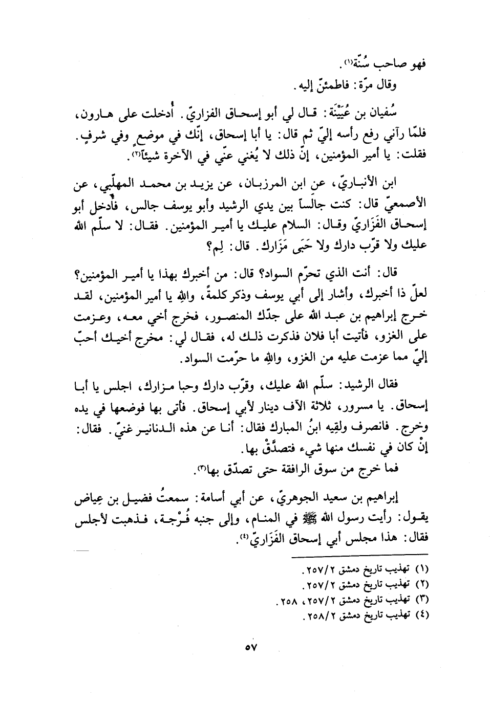 سُفْيَانُ بْنُ عُيَيْنَةَ: قَالَ لِي أَبُو إِسْحَاقَ الْفَزَارِيُّ. أُدْخِلْتُ عَلَى هَارُونَ، فَلَمَّا رَآنِي رَفَعَ رَأْسَهُ إِلَيَّ ثُمَّ قَالَ: يَا أَبَا إِسْحَاقَ، إِنَّكَ فِي مَوْضِعٍ وَفِي شَرَفٍ.