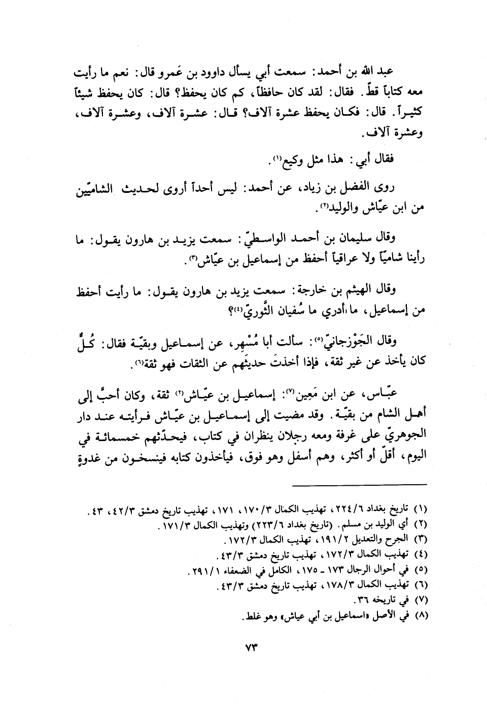 رَوَى الْفَضْلُ بْنُ زِيَادٍ، عَنْ أَحْمَدَ: لَيْسَ أَحَدًا أَرْوَى لِحَدِيثِ الشَّامِيِّينَ مِنَ ابْنِ عَيَّاشٍ وَالْوَلِيدِ [2] .