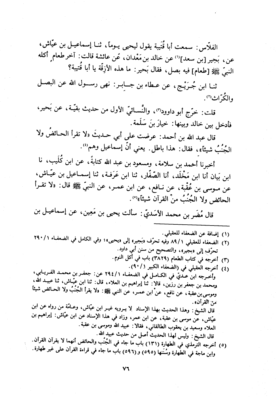 أَخْبَرَنَا أَحْمَدُ بْنُ سَلامَةَ، وَمَسْعُودُ بْنُ عَبْدِ اللَّهِ كِتَابَةً، عَنِ ابْنِ كُلَيْبٍ، نا ابْنُ بَيَانٍ أنا ابْنُ مَخْلَدٍ، أنا الصَّفَّارُ، ثنا ابْنُ عَرَفَةَ، ثنا إِسْمَاعِيلُ بْنُ عَيَّاشٍ، عَنْ مُوسَى بْنِ عُقْبَةَ، عَنْ نَافِعٍ، عَنِ ابْنِ عُمَرَ، عَنِ النَّبِيِّ صَلَّى اللَّهُ عَلَيْهِ وَسَلَّمَ قَالَ: «لا تَقْرَأِ الْحَائِضُ وَلا الْجُنُبُ مِنَ الْقُرْآنِ شَيْئًا» [5] . قَالَ مُضَرُ بْنُ مُحَمَّدٍ الأَسَدِيُّ: سَأَلْتُ يَحْيَى بْنَ مَعِينٍ، عَنْ إِسْمَاعِيلَ بن