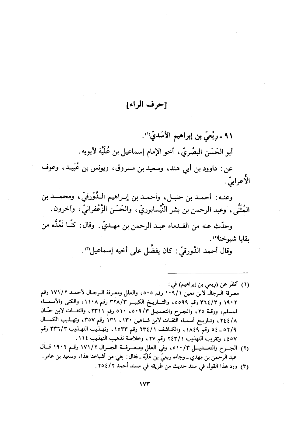 [2] الجرح والتعديل 3/ 510، وفي العلل ومعرفة الرجال 2/ 171 رقم 1902 قال عبد الرحمن بن مهدي- وجاءه ربعيّ بن عليّة- فقال: بقي من أشياخنا هذا، وسعيد بن عامر.