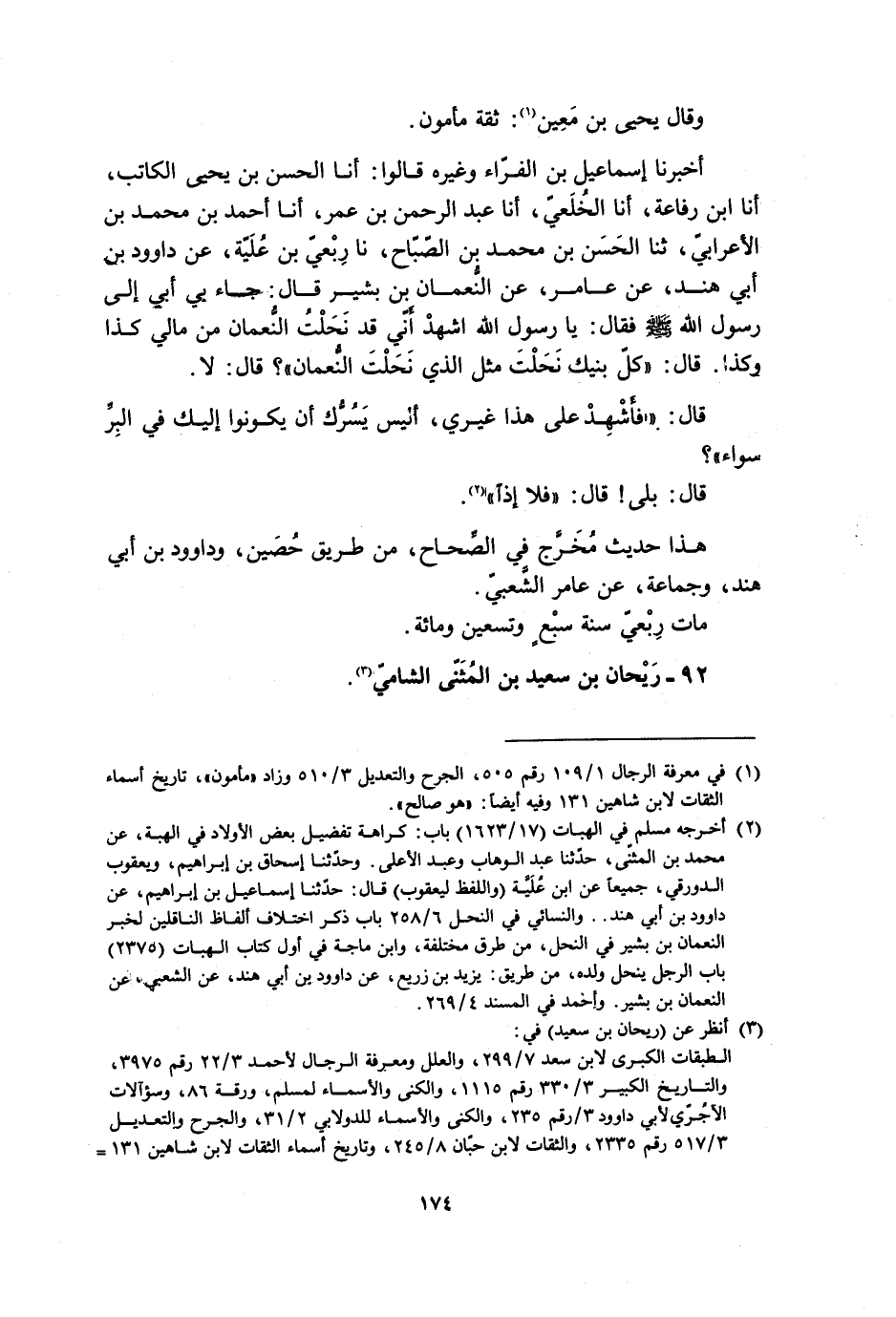 أَخْبَرَنَا إِسْمَاعِيلُ بْنُ الْفَرَّاءِ وَغَيْرُهُ قَالُوا: أَنَا الْحَسَنُ بْنُ يَحْيَى الْكَاتِبُ، أَنَا ابْنُ رِفَاعَةَ، أَنَا الْخُلَعِيُّ، أَنَا عَبْدُ الرَّحْمَنِ بْنُ عُمَرَ، أَنَا أَحْمَدُ بْنُ مُحَمَّدِ بْنِ الأَعْرَابِيِّ، ثَنَا الْحَسَنُ بْنُ مُحَمَّدِ بْنِ الصَّبَّاحِ، نَا رِبْعِيُّ بْنُ عُلَيَّةَ، عَنْ دَاوُدَ بْنِ أَبِي هِنْدٍ، عَنْ عَامِرٍ، عَنِ النُّعْمَانِ بْنِ بَشِيرٍ قَالَ: جَاءَ بِي أَبِي إِلَى رَسُولِ اللَّهِ صَلَّى اللَّهُ عَلَيْهِ وَسَلَّمَ فَقَالَ: يا رسول الله اشهد إِنِّي قَدْ نَحَلْتُ النُّعْمَانَ مِنْ مَالِي كَذَا وَكَذَا قَالَ: «كُلُّ بَنِيكَ نَحَلْتَ مِثْلَ الَّذِي نَحَلْتَ النُّعْمَانَ» ؟ قَالَ: لا.