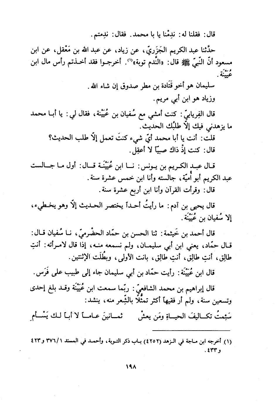 قَالَ الفِريابيّ: كنت أمشي مَعَ سُفْيان بْن عُيَيْنَة، فقال لي: يا أبا محمد ما يزهدني فيك إلا طلبُك الحديث.