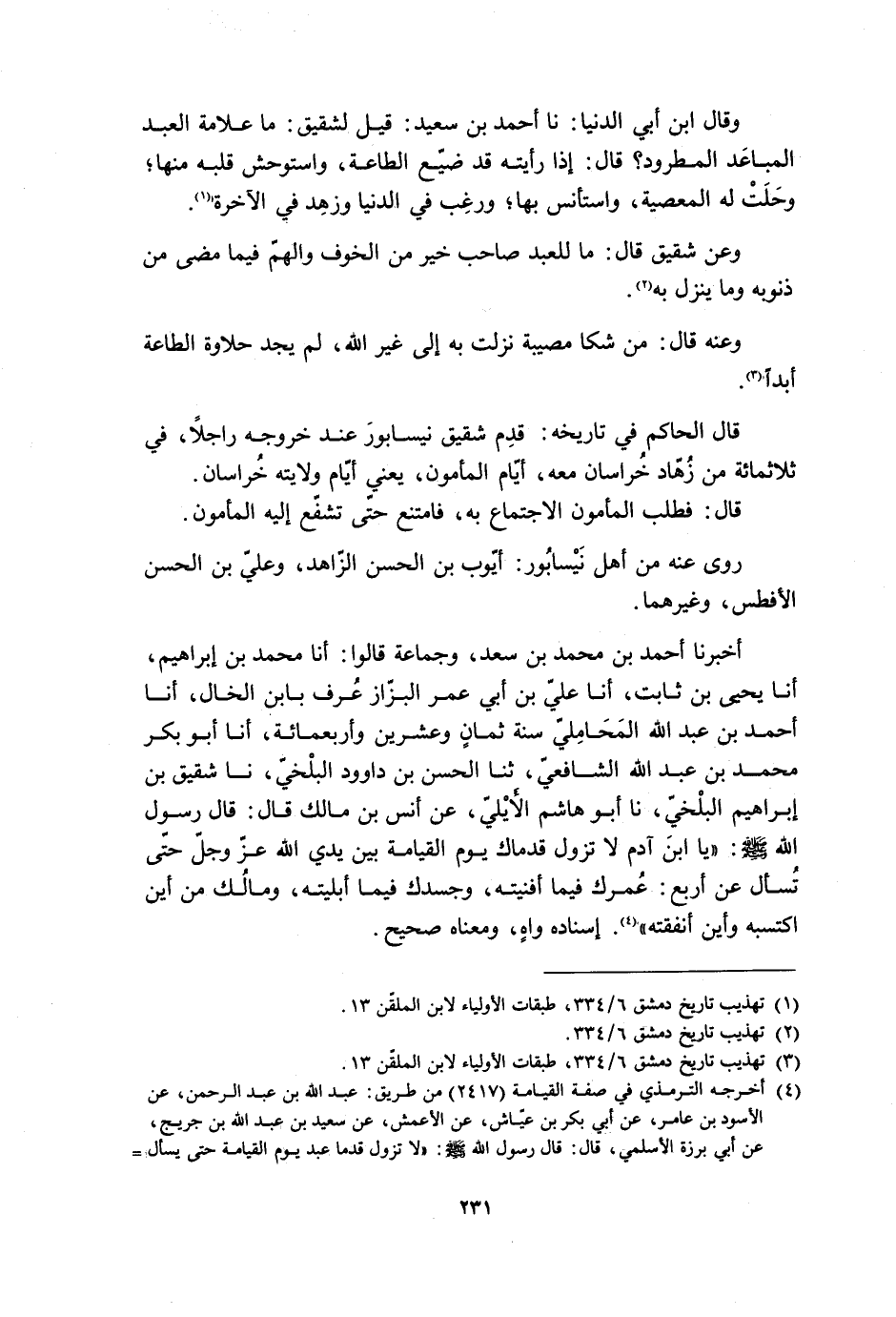أَخْبَرَنَا أَحْمَدُ بْنُ مُحَمَّدِ بْنِ سَعْدٍ، وَجَمَاعَةٌ قَالُوا: أَنَا مُحَمَّدُ بْنُ إِبْرَاهِيمَ، أَنَا يَحْيَى بْنُ ثَابِتٍ، أَنَا عَلِيُّ بْنُ أَبِي عُمَرَ الْبَزَّازُ عُرِفَ بِابْنِ الْخَالِ، أَنَا أَحْمَدُ بْنُ عَبْدِ اللَّهِ الْمَحَامِلِيُّ سَنَةَ ثَمَانٍ وَعِشْرِينَ وَأَرْبَعِمِائَةٍ، أَنَا أَبُو بَكْرٍ مُحَمَّدُ بْنُ عَبْدِ اللَّهِ الشَّافِعِيُّ، ثَنَا الْحَسَنُ بْنُ دَاوُدَ الْبَلْخِيُّ، نَا شَقِيقُ بْنُ إِبْرَاهِيمَ الْبَلْخِيُّ، نَا أَبُو هَاشِمٍ الأَيْلِيُّ، عَنْ أَنَسِ بْنِ مَالِكٍ قَالَ: قَالَ رَسُولُ اللَّهِ صَلَّى اللَّهُ عَلَيْهِ وَسَلَّمَ: «يَا ابْنَ آدَمَ لا تَزُولُ قَدَمَاكَ يَوْمَ الْقِيَامَةِ بَيْنَ يَدَيِ اللَّهِ عَزَّ وَجَلَّ حَتَّى تُسْأَلَ عَنْ أَرْبَعٍ: عُمْرُكَ فِيمَا أَفْنَيْتَهُ، وَجَسَدُكَ فِيمَا أَبْلَيْتَهُ، ومالك من أين اكتسبه وأين أنفقته» [4] . إسناده واه، ومعناه صحيح.