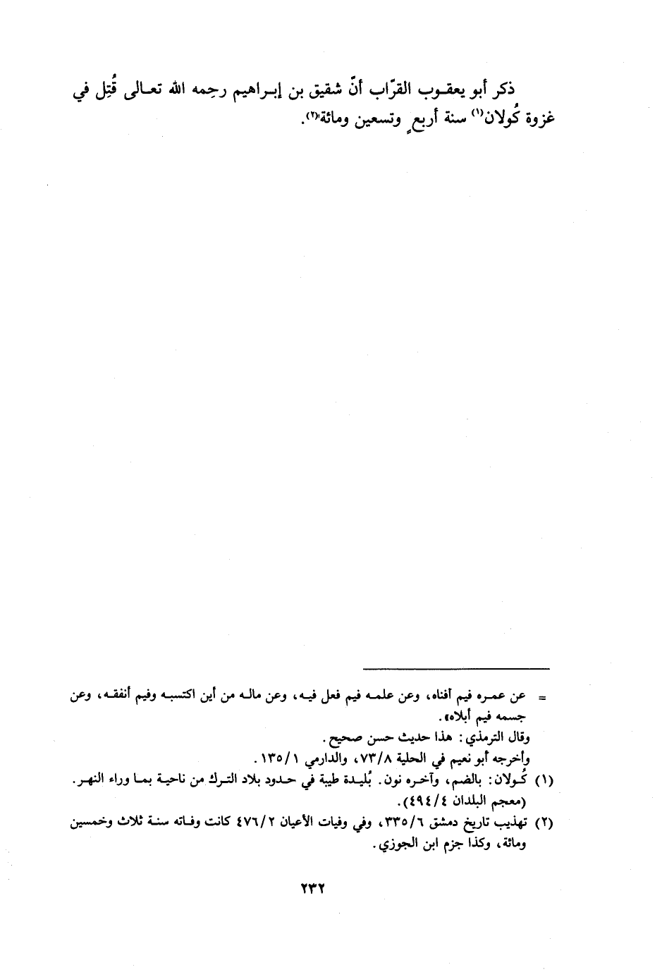 ذكر أبو يعقوب القرّاب أنّ شقيق بْن إبراهيم رحِمه الله تعالى قُتِل في غزوة كولان [1] سنة أربع وتسعين ومائة [2] .