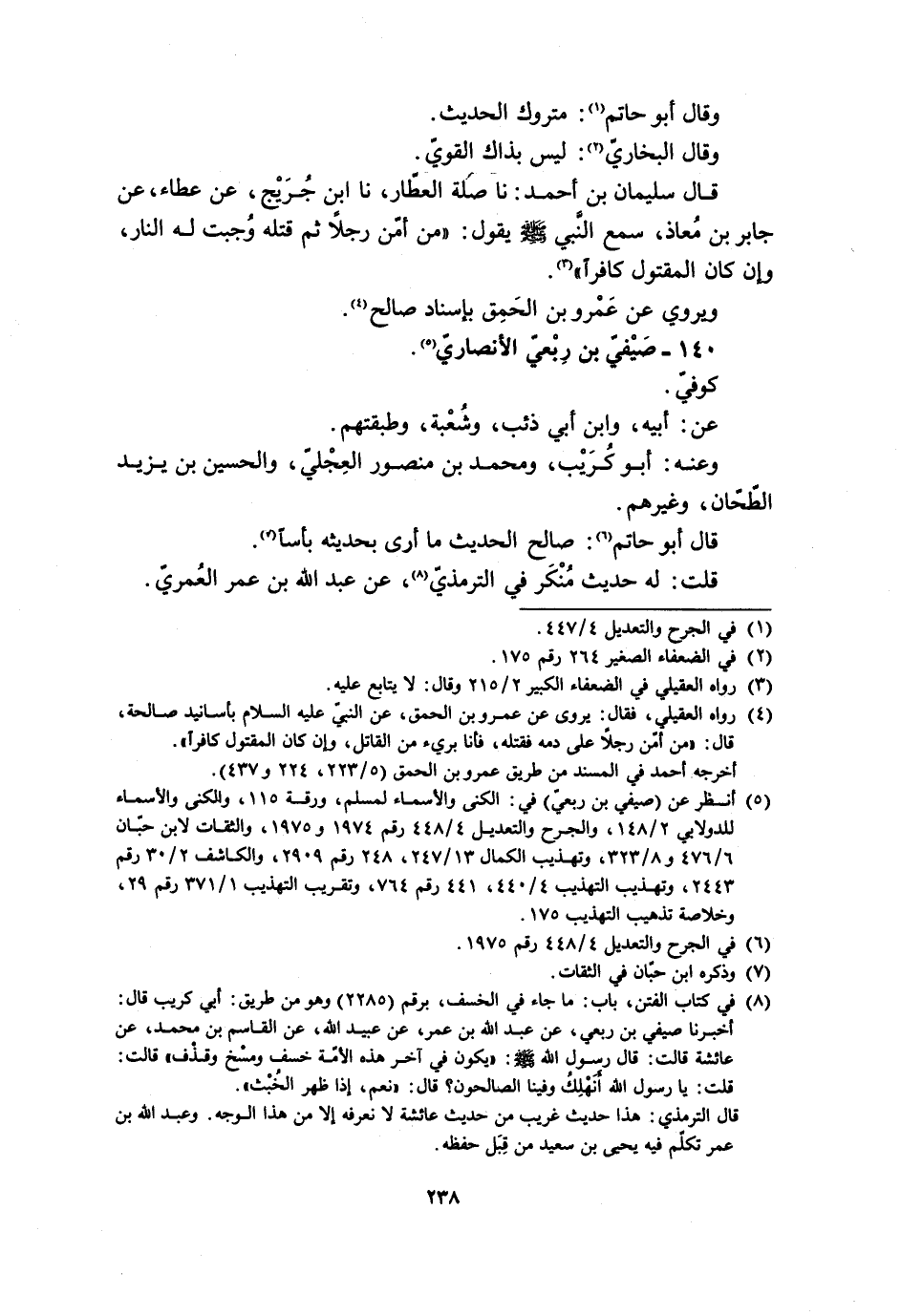 [5] انظر عن (صيفي بن ربعيّ) في: الكنى والأسماء لمسلم، ورقة 115، والكنى والأسماء للدولابي 2/ 148، والجرح والتعديل 4/ 448 رقم 1974 و 1975، والثقات لابن حبّان 6/ 476 و 8/ 323، وتهذيب الكمال 13/ 247، 248 رقم 2909، والكاشف 2/ 30 رقم 2443، وتهذيب التهذيب 4/ 440، 441 رقم 764، وتقريب التهذيب 1/ 371 رقم 29، وخلاصة تذهيب التهذيب 175.