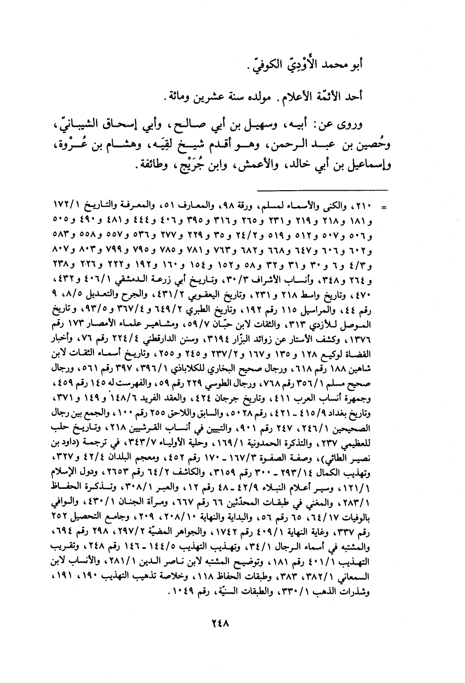 [ () ] 210، والكنى والأسماء لمسلم، ورقة 98، والمعارف 51، والمعرفة والتاريخ 1/ 172 و 181 و 218 و 219 و 231 و 265 و 316 و 395 و 406 و 444 و 481 و 490 و 505 و 506 و 507 و 512 و 519 و 2/ 24 و 35 و 229 و 277 و 536 و 557 و 558 و 583 و 602 و 606 و 647 و 668 و 682 و 763 و 781 و 785 و 795 و 799 و 803 و 807 و 3/ 4 و 6 و 30 و 31 و 32 و 58 و 152 و 154 و 160 و 192 و 222 و 226 و 238 و 264 و 348، وأنساب الأشراف 3/ 30، وتاريخ أبي زرعة الدمشقيّ 1/ 406 و 432، 470، وتاريخ واسط 218 و 231، وتاريخ اليعقوبي 2/ 431، والجرح والتعديل 5/ 8، 9 رقم 44، والمراسيل 115 رقم 192، وتاريخ الطبري 2/ 649 و 4/ 367 و 5/ 93، وتاريخ الموصل للأزدي 313، والثقات لابن حبّان 7/ 59، ومشاهير علماء الأمصار 173 رقم 1376، وكشف الأستار عن زوائد البزّار 3194، وسنن الدارقطنيّ 4/ 224 رقم 76، وأخبار القضاة لوكيع 128 و 135 و 167 و 2/ 237 و 245 و 255، وتاريخ أسماء الثقات لابن شاهين 188 رقم 618، ورجال صحيح البخاري للكلاباذي 1/ 396، 397 رقم 561، ورجال صحيح مسلم 1/ 356 رقم 768، ورجال الطوسي 229 رقم 59، والفهرست له 145 رقم 459، وجمهرة أنساب العرب 411، وتاريخ جرجان 424، والعقد الفريد 6/ 148 و 149 و 371، وتاريخ بغداد 9/ 415- 421، رقم 5028، والسابق واللاحق 255 رقم 100، والجمع بين رجال الصحيحين 1/ 246، 247 رقم 901، والتبيين في أنساب القرشيين 218، وتاريخ حلب للعظيميّ 237، والتذكرة الحمدونية 1/ 169، وحلية الأولياء 7/ 343، في ترجمة (داود بن نصير الطائي) ، وصفة الصفوة 3/ 167- 170 رقم 452، ومعجم البلدان 4/ 42 و 327، وتهذيب الكمال 14/ 293- 300 رقم 3159، والكاشف 2/ 64 رقم 2653، ودول الإسلام 1/ 121، وسير أعلام النبلاء 9/ 42- 48 رقم 12، والعبر 1/ 308، وتذكرة الحفاظ 1/ 283، والمغني في طبقات المحدّثين 66 رقم 667، ومرآة الجنان 1/ 430، والوافي بالوفيات 17/ 64، 65 رقم 56، والبداية والنهاية 10/ 208، 209، وجامع التحصيل 252 رقم 337، وغاية النهاية 1/ 409 رقم 1742، والجواهر المضيّة 2/ 297، 298 رقم 694، والمشتبه في أسماء الرجال 1/ 34، وتهذيب التهذيب 5/ 144- 146 رقم 248، وتقريب التهذيب 1/ 401 رقم 181، وتوضيح المشتبه لابن ناصر الدين 1/ 281، والأنساب لابن السمعاني 1/ 382، 383، وطبقات الحفاظ 118، وخلاصة تذهيب التهذيب 190، 191، وشذرات الذهب 1/ 330، والطبقات السنيّة، رقم 1049.