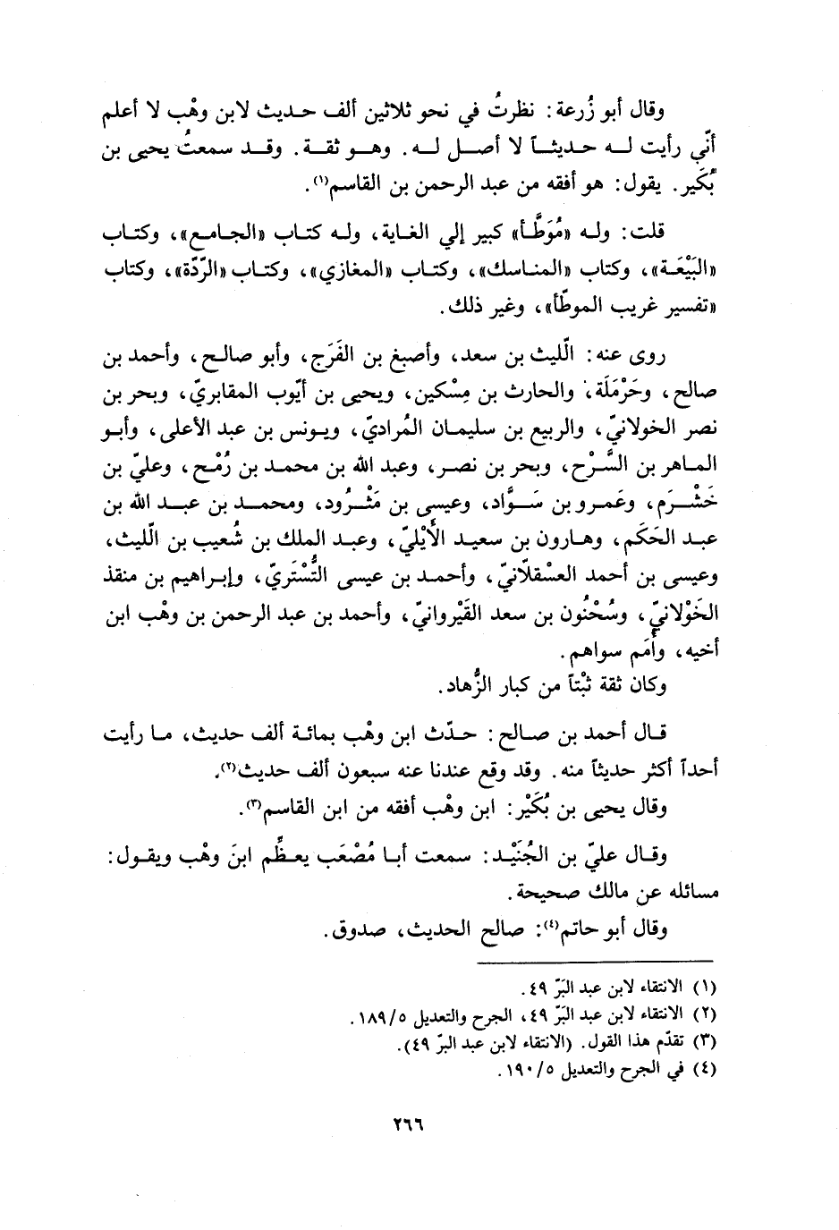 وقال أبو زُرْعة: نظرتُ في نحو ثلاثين ألف حديث لابن وهْب لا أعلم أنّي رَأَيْت لَهُ حديثًا لا أصل لَهُ. وهو ثقة. وقد سَمِعْتُ يحيى بْن بُكَيْر. يَقُولُ: هُوَ أفقه مِن عَبْد الرَّحْمَن بْن القاسم [1] .