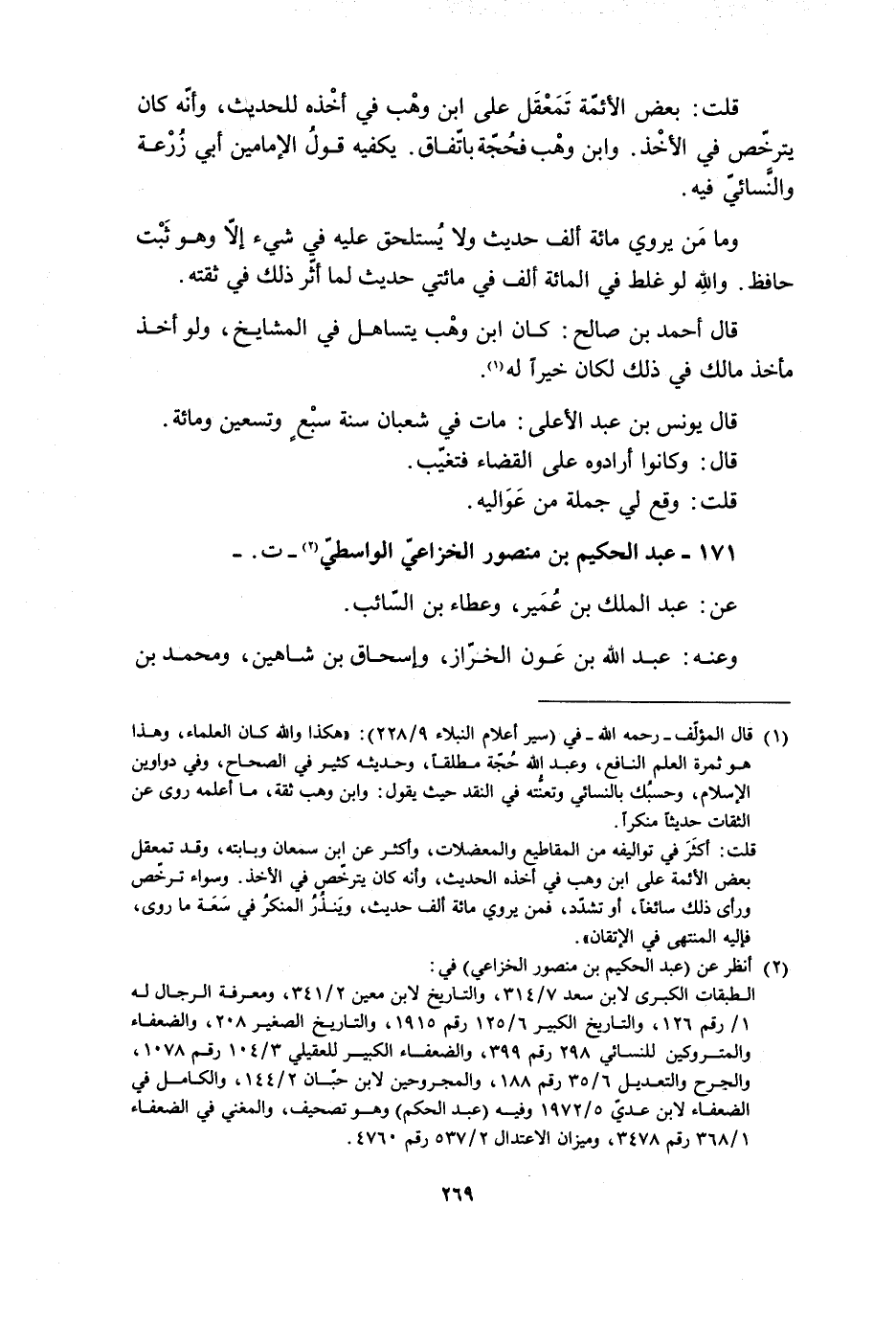 [1] قال المؤلّف- رحمه الله- في (سير أعلام النبلاء 9/ 228) : «هكذا والله كان العلماء، وهذا هو ثمرة العلم النافع، وعبد الله حجّة مطلقا، وحديثه كثير في الصحاح، وفي دواوين الإسلام، وحسبك بالنسائي وتعنّته في النقد حيث يقول: وابن وهْب ثقة، ما أعلمه روى عَنِ الثَّقات حديثا منكرا.