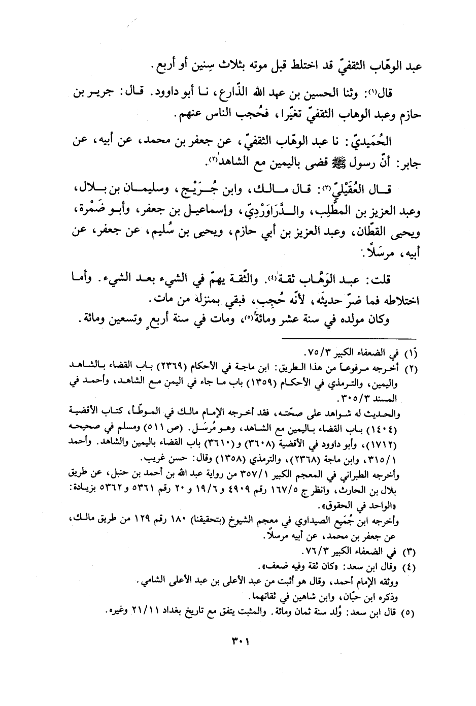 الْحُمَيْدِيُّ: نا عَبْدُ الْوَهَّابِ الثَّقَفِيُّ، عَنْ جَعْفَرِ بْنِ مُحَمَّدٍ، عَنْ أَبِيهِ، عَنْ جَابِرٍ: أنّ رسول صَلَّى اللَّهُ عَلَيْهِ وَسَلَّمَ قَضَى بِالْيَمِينِ مَعَ الشَّاهِدِ [2] . قَالَ الْعُقَيْلِيُّ [3] : قَالَ مَالِكٌ، وَابْنُ جُرَيْجٍ، وَسُلَيْمَانُ بْنُ بِلالٍ، وَعَبْدُ الْعَزِيزِ بْنُ الْمُطَّلِبِ، وَالدَّرَاوَرْدِيُّ، وَإِسْمَاعِيلُ بْنُ جَعْفَرٍ، وَأَبُو ضَمْرَةَ، وَيَحْيَى الْقَطَّانُ، وَعَبْدُ الْعَزِيزِ بْنُ أَبِي حَازِمٍ، وَيَحْيَى بْنُ سُلَيْمٍ، عَنْ جَعْفَرٍ، عَنْ أَبِيهِ، مُرْسَلا.