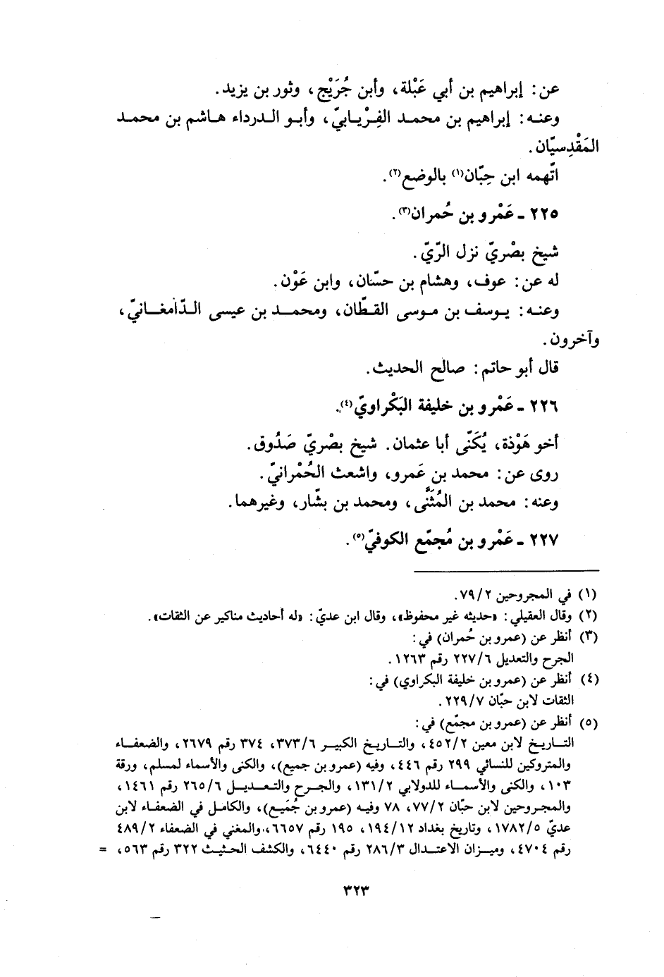 التاريخ لابن معين 2/ 452، والتاريخ الكبير 6/ 373، 374 رقم 2679، والضعفاء والمتروكين للنسائي 299 رقم 446، وفيه (عمرو بن جميع) ، والكنى والأسماء لمسلم، ورقة 103، والكنى والأسماء للدولابي 2/ 131، والجرح والتعديل 6/ 265 رقم 1461، والمجروحين لابن حبّان 2/ 77، 78 وفيه (عمرو بن جميع) ، والكامل في الضعفاء لابن عديّ 5/ 1782، وتاريخ بغداد 12/ 194، 195 رقم 6657، والمغني في الضعفاء 2/ 489 رقم 4704، وميزان الاعتدال 3/ 286 رقم 6440، والكشف الحثيث 322 رقم 563،