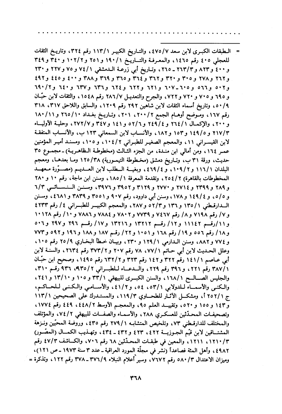 [ () ] الطبقات الكبرى لابن سعد 7/ 475، والتاريخ الكبير 1/ 113 رقم 324، وتاريخ الثقات للعجلي 405 رقم 1465، والمعرفة والتاريخ 1/ 190 و 251 و 2/ 102 و 340 و 349 و 400 و 823 و 3/ 263- 265، وتاريخ أبي زرعة الدمشقيّ 1/ 74 و 75 و 227 و 230 و 262 و 278 و 305 و 320 و 362 و 364 و 365 و 369 و 388 و 400 و 445 و 492 و 502 و 566 و 605- 607 و 621 و 622 و 624 و 636 و 637 و 640 و 2/ 690 و 695 و 705 و 720 و 722، والجرح والتعديل 7/ 286 رقم 1548، والثقات لابن حبّان 9/ 50، وتاريخ أسماء الثقات لابن شاهين 292 رقم 1209، والسابق واللاحق 317، 318 رقم 167، وموضع أوهام الجمع 2/ 200، 201، وتاريخ بغداد 10/ 265 و 11/ 180 و 200، والإكمال 1/ 264 و 4/ 249 و 6/ 52 و 141 و 347 و 7/ 272، وحلية الأولياء 3/ 217 و 5/ 149 و 153 و 182، والأنساب لابن السمعاني 123 ب، والأنساب المتفقة لابن القيسراني 11، والمعجم الصغير للطبراني 2/ 104، و 105، ومسند أمير المؤمنين عمر 164، ومن أمالي ابن مندة، من الجزء الثالث (مخطوطة الظاهرية) - مجموع 35 حديث، ورقة 31 ب، وتاريخ دمشق (مخطوطة التيمورية) 38/ 125 وما بعدها، ومعجم البلدان 1/ 116 و 2/ 109 و 4/ 469، وبغية الطلب لابن العديم (مصوّرة معهد المخطوطات بالقاهرة) 2/ 254، وتقدمة المعرفة 1/ 185، وسنن ابن ماجة، رقم 10 و 280 و 289 و 2399 و 2714 و 2770 و 3129 و 3952 و 3976، وسنن النسائي 3/ 6 و 5/ 5، و 4/ 149 و 178، وسنن أبي داود، رقم 907 و 3551 و 3839 و 4681، وسنن الدارقطنيّ 1/ 135 و 136 و 3/ 52 و 287، والمعجم الكبير للطبراني 4/ رقم 4233 و 7/ رقم 7198 و 8/ رقم 7467 و 7739 و 7802 و 7884 و 7886 و 10/ رقم 10128 و 11/ رقم 11142 و 12/ رقم 13212 و 13216 و 17/ رقم 296 و 297 و 506 و 18/ رقم 556 و 19/ رقم 168 و 1051 و 22/ رقم 187 و 188 و 196 و 592 و 773 و 774 و 882، وسنن الدارميّ 1/ 129 و 230، وبيان خطأ البخاري 9/ 25 رقم 105، وعلل الحديث لابن أبي حاتم 1/ 77، 78 رقم 207 و 2/ 373 رقم 2634، والسنة لابن أبي عاصم 1/ 141 رقم 322 و 142 رقم 323 و 2/ 632 رقم 1495، وصحيح ابن حبّان 1/ 387 رقم 221، و 396، رقم 229، والدعاء للطبراني 2/ 935، 936 رقم 310، والجليس الصالح 1/ 168، والسنن الكبرى للبيهقي 1/ 33 و 105 و 10/ 13 و 241، والكنى والأسماء للدولابي 1/ 53، 54، و 2/ 41، والأسامي والكنى للحاكم، ج 1/ 252 أ، ومشكل الآثار للطحاوي 3/ 119، والمستدرك على الصحيحين 1/ 113، و 143 و 155 و 520، وتقييد العلم 95، والمعجم الأوسط 2/ 448، 449 رقم 1774، وتصحيفات المحدّثين للعسكريّ 288، والأسماء والصفات للبيهقي 2/ 74، والمؤتلف والمختلف للدارقطنيّ 73، وتلخيص المتشابه 1/ 279 رقم 435، وروضة المحبّين ونزهة المشتاقين لابن قيّم الجوزية 422، 423 و 432- 434، وتهذيب الكمال (المصوّر) 3/ 1210، 1211، والمعين في طبقات المحدّثين 68 رقم 706، والكاشف 3/ 47 رقم 4982، وأهل المائة فصاعدا (نشر في مجلّة المورد العراقية- عدد 3 سنة 1973- ص 121) ، وميزان الاعتدال 3/ 580 رقم 7672، وسير أعلام النبلاء 9/ 376- 378 رقم 122، وتذكرة