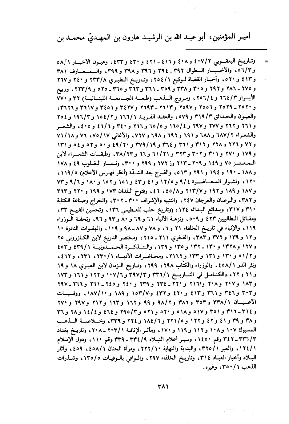 [ () ] وتاريخ اليعقوبي 2/ 407 و 408 و 416- 421 و 430 و 433، وعيون الأخبار 1/ 58 و 3/ 56، والأخبار الطوال 392- 394 و 396 و 398 و 399، والمعارف 381 و 413 و 520، وأخبار القضاة لوكيع 1/ 254، وتاريخ الطبري 8/ 233 و 240 و 267 و 275- 286 و 292 و 305 و 338 و 359- 361 و 363 و 365- 525 و 9/ 223، وربيع الأبرار 3/ 664 و 4/ 256، ومروج الذهب (طبعة الجامعة اللبنانية) 32 و 770 و 2520- 2529 و 2556 و 2597 و 2613- 2693 و 3427 و 3451 و 3617 و 3626، والعيون والحدائق 3/ 319 و 579، والعقد والفريد 1/ 166 و 2/ 154 و 3/ 196 و 254 و 261 و 262 و 277 و 297 و 4/ 165 و 5/ 65 و 266 و 340 و 6/ 46 و 405، والشعر والشعراء 2/ 687 و 688 و 691 و 692 و 698 و 727، والأغاني 17/ 75، 76 و 18/ 71 و 72 و 226 و 228 و 312 و 361 و 364 و 19/ 379 و 20/ 49 و 50 و 52 و 54 و 131 و 179 و 270 و 301 و 302 و 323 و 21/ 61 و 66 و 23/ 38، وطبقات الشعراء لابن المعتز 75 و 149 و 209- 213 و 272 و 299 و 300، وثمار القلوب 49 و 178 و 188- 190 و 194 و 291 و 513، والفرج بعد الشدّة (انظر فهرس الأعلام) 5/ 119، 120، ونشوار المحاضرة 4/ 9 و 5/ 12 و 41 و 43 و 151 و 152 و 180 و 6/ 9 و 73 و 187 و 189 و 192 و 7/ 213 و 8/ 45، 46، وفتوح البلدان 173 و 199 و 220 و 363 و 382، والبرصان والعرجان 247، والتنبيه والإشراف 300- 302، والخراج وصناعة الكتابة 310 و 317، وبدائع البدائه 124، (وتاريخ حلب للعظيميّ 136، وتحسين القبيح 33، ومقاتل الطالبيين 423 و 509، ونزهة الألباء 61 و 69 و 80 و 93 و 96، وتحفة الوزراء 119، والإنباء في تاريخ الخلفاء 21 و 6، و 78 و 87- 98 و 109، والهفوات النادرة 10 و 12 و 139 و 372 و 383، والفخري 211- 215، ومختصر التاريخ لابن الكازروني 25 و 127 و 1328 و 130- 132 و 135 و 139، والتذكرة الحمدونية 1/ 439 و 453 و 2/ 51 و 130 و 131 و 133 و 2162، ومحاضرات الأدباء 1/ 230، 231، و 462، ونثر الدر 1/ 458، والوزراء والكتّاب 298، 299، وتاريخ الزمان لابن العبري 18 و 19 و 21 و 22، والكامل في التاريخ 1/ 336 و 3/ 397 و 6/ 107 و 122 و 161 و 173 و 183 و 207 و 208 و 216 و 221- 234 و 239 و 240 و 245- 261 و 266- 297 و 303 و 346 و 361 و 413 و 420 و 432 و 7/ 153 و 189 و 10/ 187، ووفيات الأعيان 1/ 338 و 353 و 386 و 2/ 98 و 99 و 162 و 163 و 212 و 297 و 270 و 314- 316 و 351 و 517 و 518 و 520 و 521 و 3/ 295 و 464 و 4/ 14 و 28 و 36 و 38 و 39 و 41 و 42 و 122 و 5/ 221 و 6/ 184 و 224 و 339، وخلاصة الذهب المسبوك 107 و 108 و 112 و 119 و 170، ومآثر الإنافة 1/ 203- 208، وتاريخ بغداد 3/ 336- 342 رقم 1450، وسير أعلام النبلاء 9/ 334- 339 رقم 110، ودول الإسلام 1/ 124، والعبر 1/ 325، والبداية النهاية 10/ 222، ومرآة الجنان 1/ 458، 459، وآثار البلاد وأخبار العباد 314، وتاريخ الخلفاء 297، والوافي بالوفيات 5/ 135، وشذرات الذهب 1/ 350، وغيره.