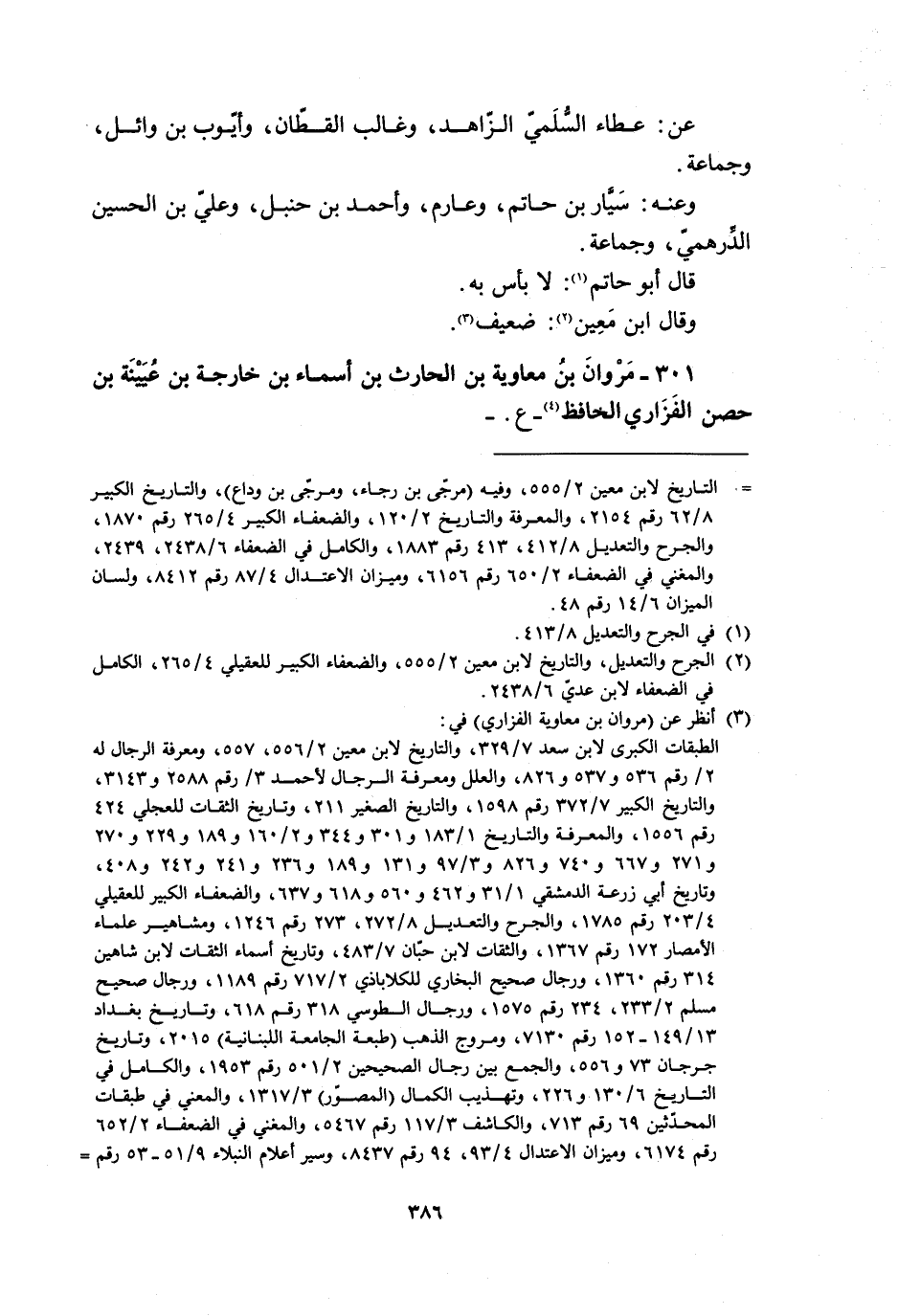 [2] الجرح والتعديل، والتاريخ لابن معين 2/ 555، والضعفاء الكبير للعقيليّ 4/ 265، الكامل في الضعفاء لابن عديّ 6/ 2438.