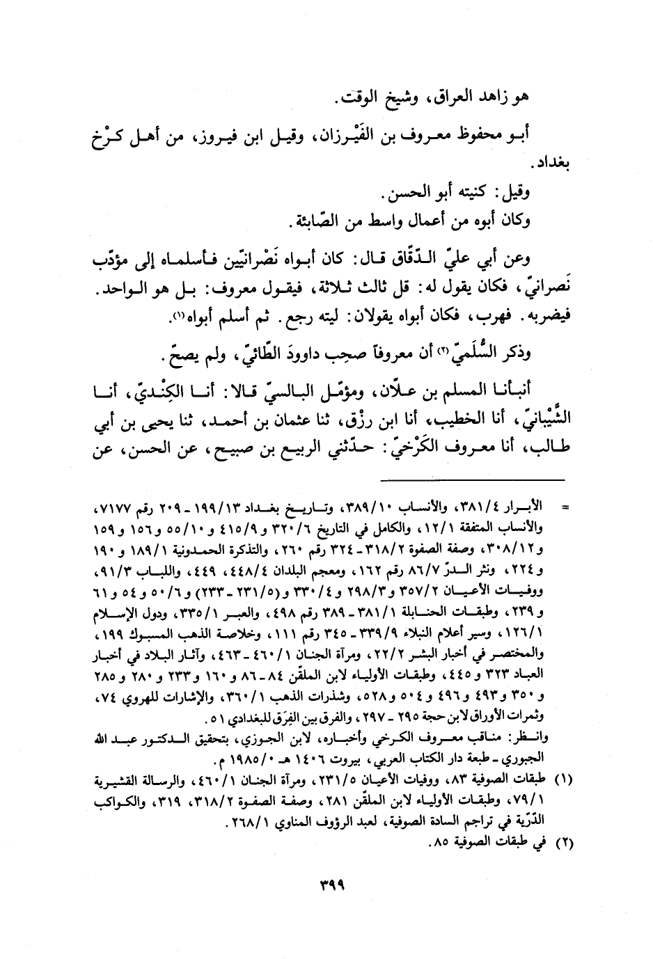 وانظر: مناقب معروف الكرخي وأخباره، لابن الجوزي، بتحقيق الدكتور عبد الله الجبوري- طبعة دار الكتاب العربيّ، بيروت 1406 هـ 0/ 1985 م.