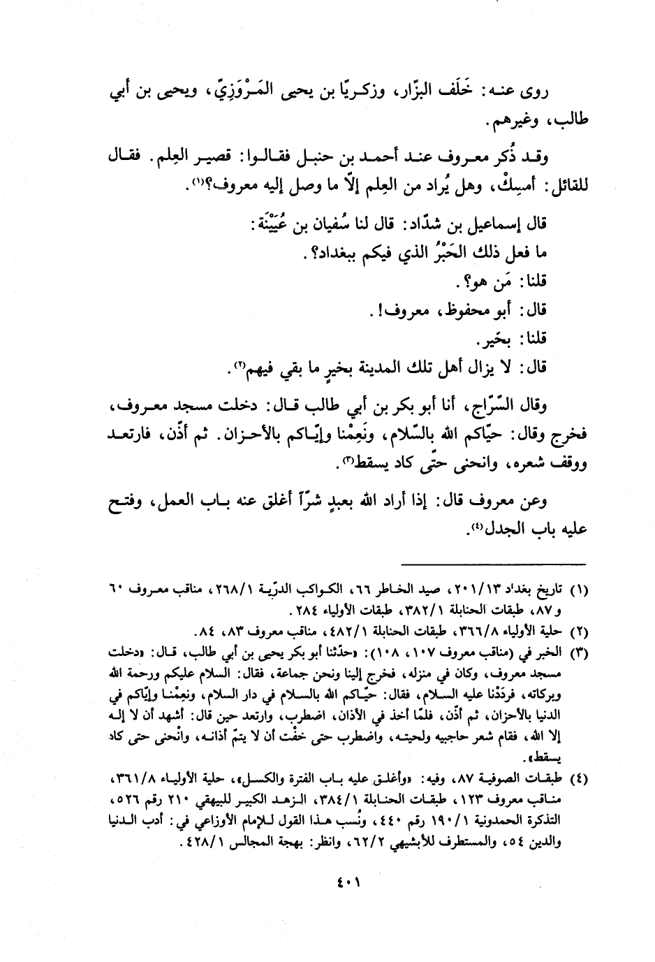 [1] تاريخ بغداد 13/ 201، صيد الخاطر 66، الكواكب الدرّية 1/ 268، مناقب معروف 60 و 87، طبقات الحنابلة 1/ 382، طبقات الأولياء 284.