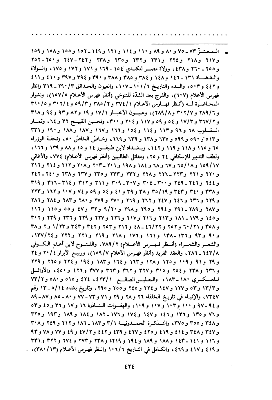 [ () ] المعتزّ 73- 75 و 80 و 89 و 110 و 114 و 121 و 149- 152 و 155 و 158 و 159 و 217 و 218 و 224 و 231 و 232 و 235 و 238 و 242- 247 و 250- 252 و 255- 260 و 438، وولاة مصر للكندي 154- 169 و 171 و 172 و 175، والولاة والقضاة 131- 146 و 148 و 384 و 385 و 388 و 390 و 394 و 397 و 410 و 411 و 442 و 503، والبدء والتاريخ 6/ 101- 107، والعيون والحدائق 3/ 290- 319 وانظر فهرس الأعلام (607) ، والفرج بعد الشدّة للتنوخي (انظر فهرس الأعلام 5/ 157) ، ونشوار المحاضرة له (انظر فهارس الأعلام 1/ 374 و 2/ 385 و 3/ 59 و 4/ 302 و 5/ 310 و 6/ 289 و 7/ 302 و 8/ 289) ، وعيون الأخبار 1/ 17 و 19 و 82 و 93 و 94 و 318 و 2/ 367 و 3/ 17 و 54 و 59 و 117 و 204 و 300، وتحسين القبيح 32 و 64، وثمار القلوب 68 و 96 و 113 و 114 و 154 و 166 و 167 و 187 و 188 و 190 و 331 و 513 و 590 و 599 و 635 و 638 و 639 و 669، وخاصّ الخاصّ 50، وتحفة الوزراء 65 و 115 و 118 و 119 و 142، وبغداد لابن طيفور 14 و 15 و 88 و 139 و 166، ولطف التدبير للإسكافي 24 و 25، ومقاتل الطالبيين (انظر فهرس الأعلام) 774، والأغاني 17/ 159 و 18/ 65 و 67 و 68 و 184 و 198 و 201- 203 و 208 و 212 و 214 و 216 و 220 و 221 و 223- 226 و 228 و 232 و 233 و 235 و 237 و 238 و 240- 242 و 244 و 246- 249 و 300- 304 و 307- 309 و 311 و 312 و 314- 316 و 319 و 338 و 340 و 343 و 19/ 35 و 38 و 39 و 41 و 54 و 59 و 74 و 107 و 162 و 223 و 229 و 236 و 246 و 247 و 262 و 269 و 270 و 279 و 280 و 283 و 284 و 286 و 287 و 289- 291 و 294 و 295 و 298 و 20/ 9 و 32 و 47 و 55 و 115 و 116 و 145 و 179- 181 و 213 و 216 و 217 و 226 و 227 و 229 و 236 و 239 و 302 و 358 و 21/ 60 و 252 و 22/ 46- 48 و 212 و 253 و 342 و 343 و 23/ 1 و 2 و 38 و 90 و 93 و 136- 138 و 161 و 176 و 218 و 219 و 221 و 222 و 24/ 137، والشعر والشعراء (انظر فهرس الأعلام) 2/ 789، والفتوح لابن أعثم الكوفي 8/ 243- 286، والعقد الفريد (انظر فهرس الأعلام 7/ 159) ، وربيع الأبرار 4/ 20 و 24 و 29 و 91 و 109 و 125 و 128 و 163 و 164 و 183 و 194 و 224 و 225 و 229 و 236 و 238 و 254 و 315 و 327 و 362 و 363 و 377 و 426 و 450، والأوائل للعسكريّ 180- 183، والجليس الصالح 1/ 423، 424 و 515 و 580 و 2/ 73 و 3/ 13 و 53 و 127 و 147 و 224 و 245 و 255 و 295، وتاريخ بغداد 14/ 5- 13 رقم 7347، والإنباء في تاريخ الخلفاء 26 و 28 و 29 و 71 و 73- 77 و 80- 85 و 87- 89 و 94- 97 و 100 و 103 و 107 و 109، والهفوات النادرة 16 و 17 و 36 و 45 و 53 و 76 و 135 و 136 و 146 و 147 و 174 و 176- 182 و 184 و 189 و 193 و 325 و 348 و 355 و 375، والتذكرة الحمدونية 1/ 3 و 183- 186 و 212 و 249 و 308 و 347 و 348 و 414 و 419 و 425 و 427 و 439 و 442 و 2/ 47 و 49 و 77 و 78 و 93 و 116 و 141- 143 و 188 و 189 و 194 و 219 و 238 و 273 و 274 و 322 و 331 و 419 و 417 و 469، والكامل في التاريخ 6/ 106 وانظر فهرس الأعلام (13/ 380) ،