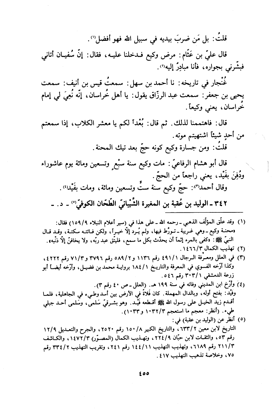 «محنة وكيع- وهي غريبة- تورّط فيها، ولم يرد إلّا خيرا، ولكن فاتته سكتة، وَقَدْ قَالَ النَّبِيُّ صَلَّى اللَّهُ عَلَيْهِ وَسَلَّمَ: «كَفَى بِالْمَرْءِ إِثْمًا أَنْ يُحَدِّثَ بِكُلِّ مَا سمع، فليتّق عبد ربّه، ولا يخافنّ إلّا ذنبه» .