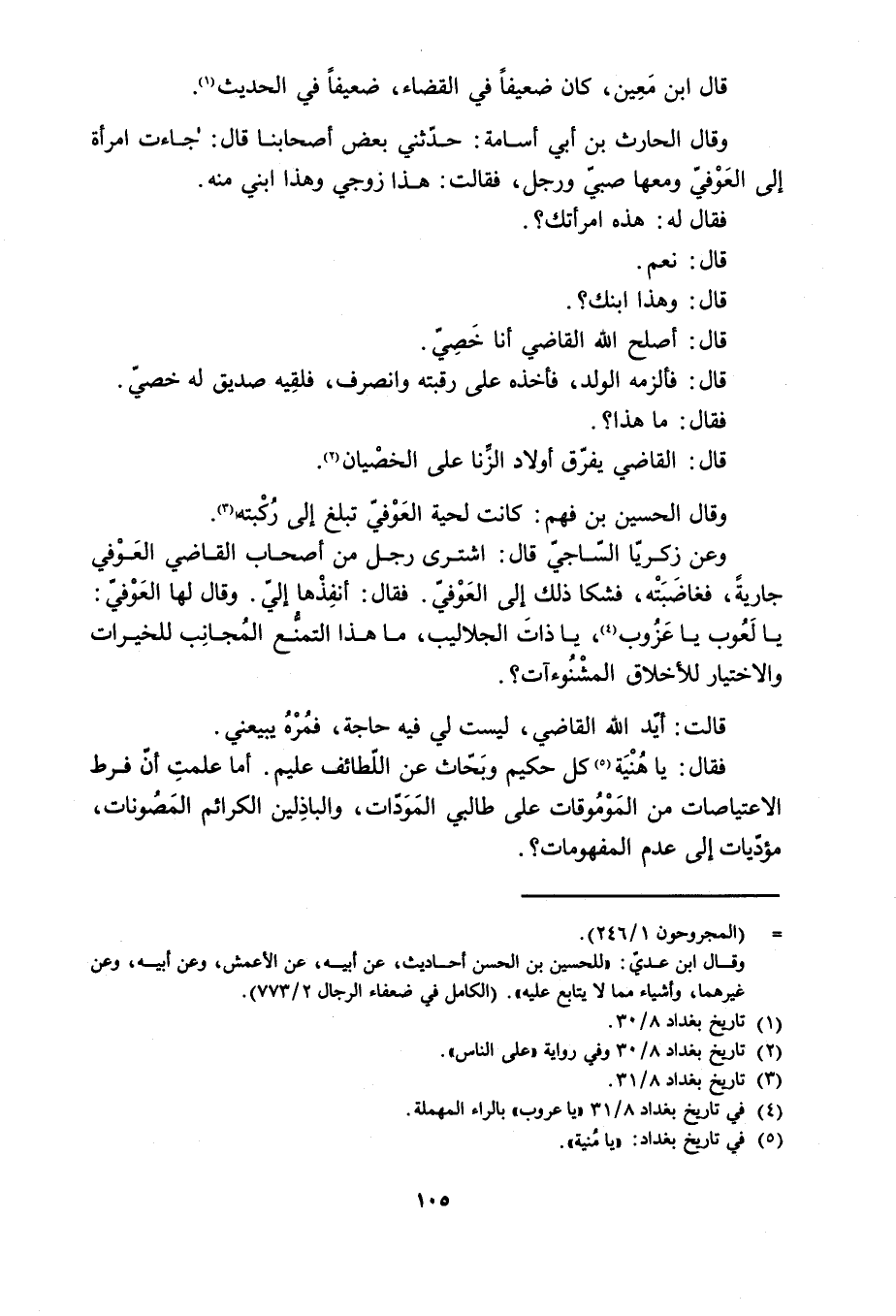 وقال الحارث بْن أَبِي أسامة: حدَّثني بعض أصحابنا قَالَ: جاءت امرأة إلى العَوْفيّ ومعها صبيّ ورجل، فقالت: هذا زوجي وهذا ابني منه.