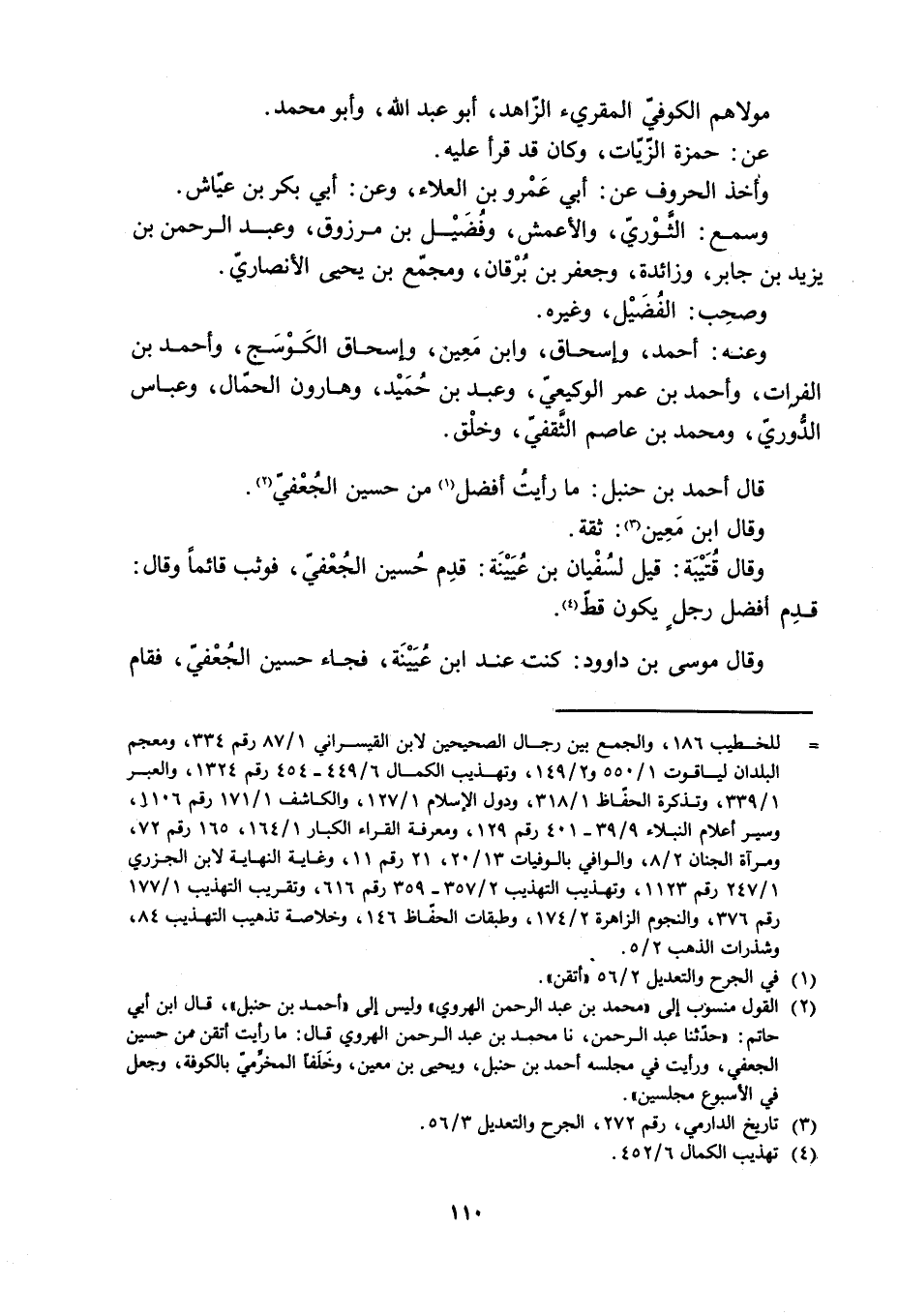 [2] القول منسوب إلى «محمد بن عبد الرحمن الهروي» وليس إلى «أحمد بن حنبل» ، قال ابن أبي حاتم: «حدّثنا عبد الرحمن، نا محمد بن عبد الرحمن الهروي قال: ما رأيت أتقن من حسين الجعفي، ورأيت في مجلسه أحمد بن حنبل، ويحيى بن معين، وخلفا المخرّميّ بالكوفة، وجعل في الأسبوع مجلسين» .