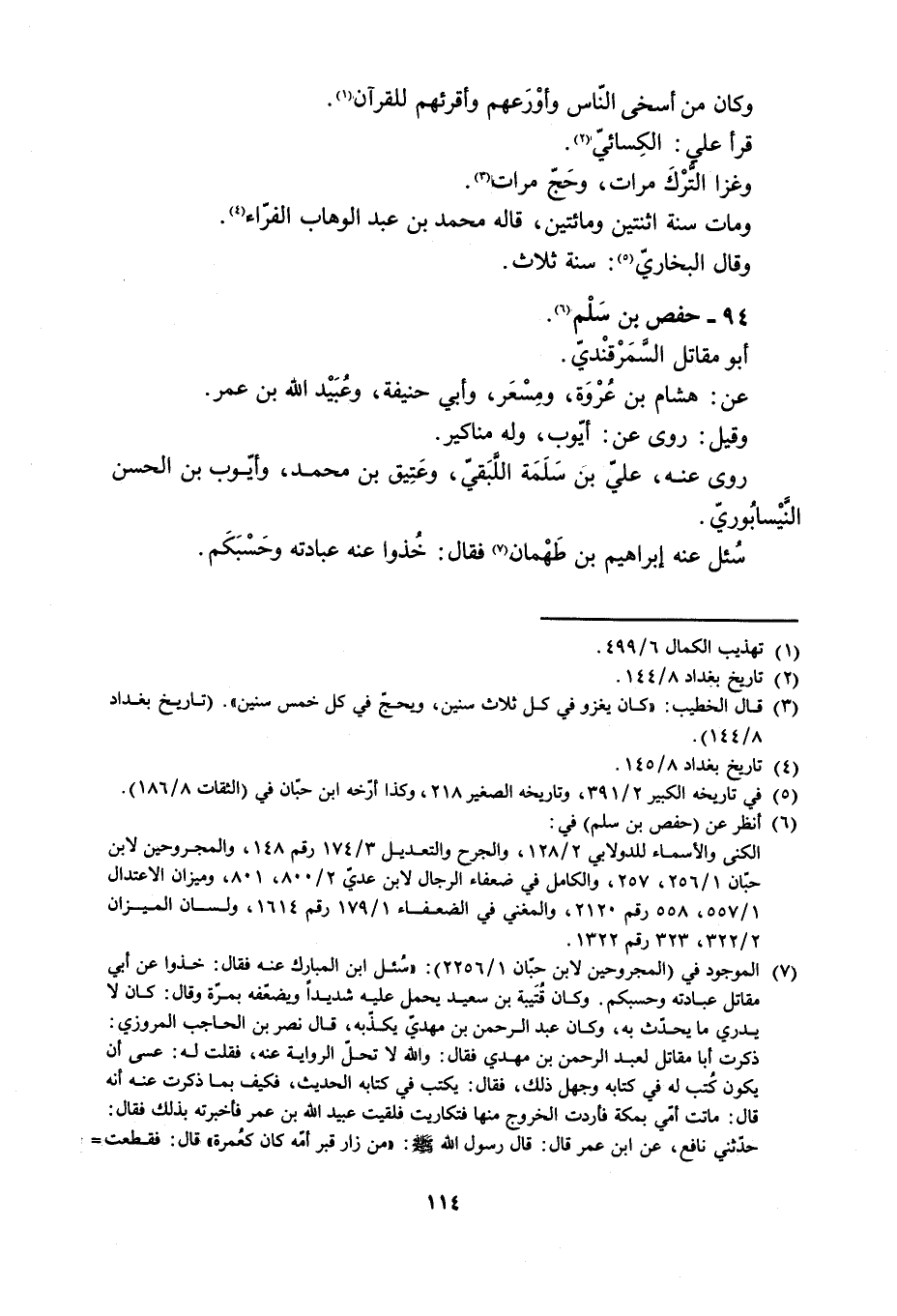 [7] الموجود في (المجروحين لابن حبّان 1/ 2256) : «سئل ابن المبارك عنه فقال: خذوا عن أبي مقاتل عبادته وحسبكم. وكان قتيبة بن سعيد يحمل عليه شديدا ويضعّفه بمرّة وقال: كان لا يدري ما يحدّث به، وكان عبد الرحمن بن مهديّ يكذّبه، قال نصر بن الحاجب المروزي: