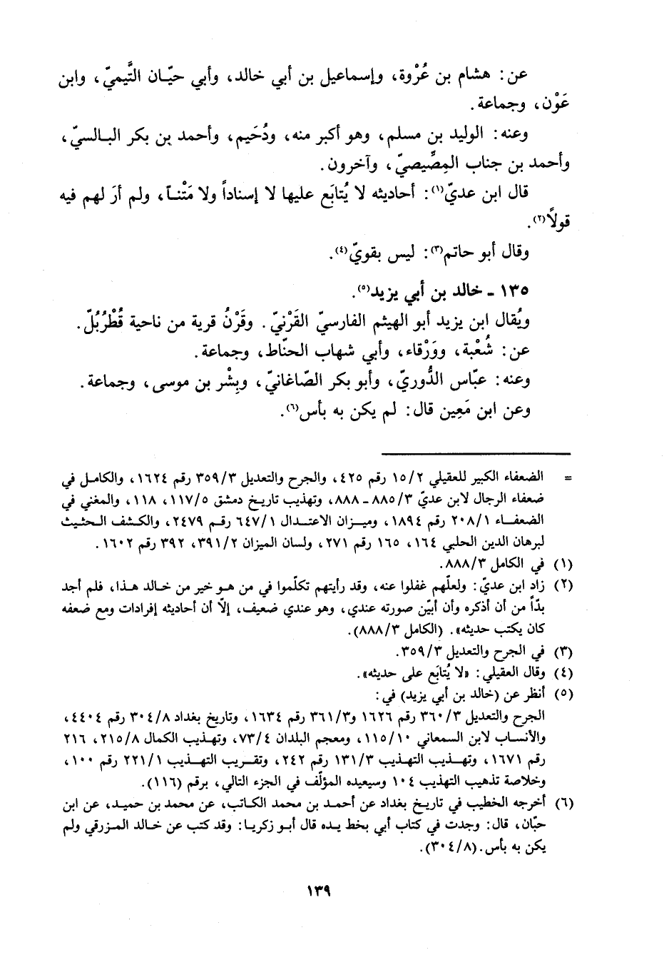 [2] زاد ابن عديّ: ولعلّهم غفلوا عنه، وقد رأيتهم تكلّموا في من هو خير من خالد هذا، فلم أجد بدّا من أن أذكره وأن أبيّن صورته عندي، وهو عندي ضعيف، إلّا أن أحاديثه إفرادات ومع ضعفه كان يكتب حديثه» . (الكامل 3/ 888) .