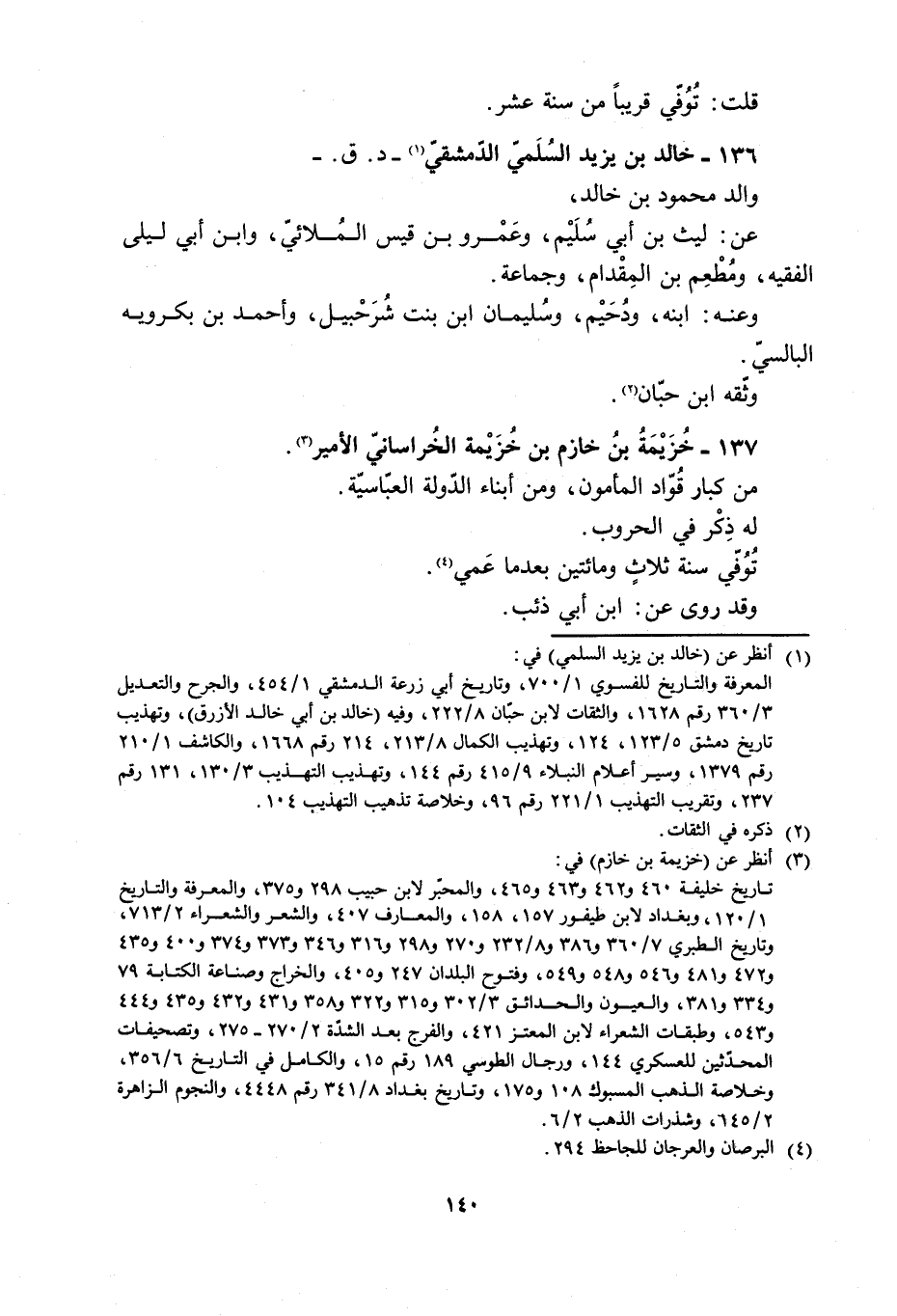 136- خَالِد بْن يزيد السُّلَميّ الدّمشقيّ [1] د. ق. - والد محمود بْن خَالِد، عَنْ: ليث بْن أَبِي سُلَيْم، وعَمْرو بْن قيس المُلائيّ، وابن أَبِي ليلى الفقيه، ومُطْعِم بْن المِقْدام، وجماعة.
