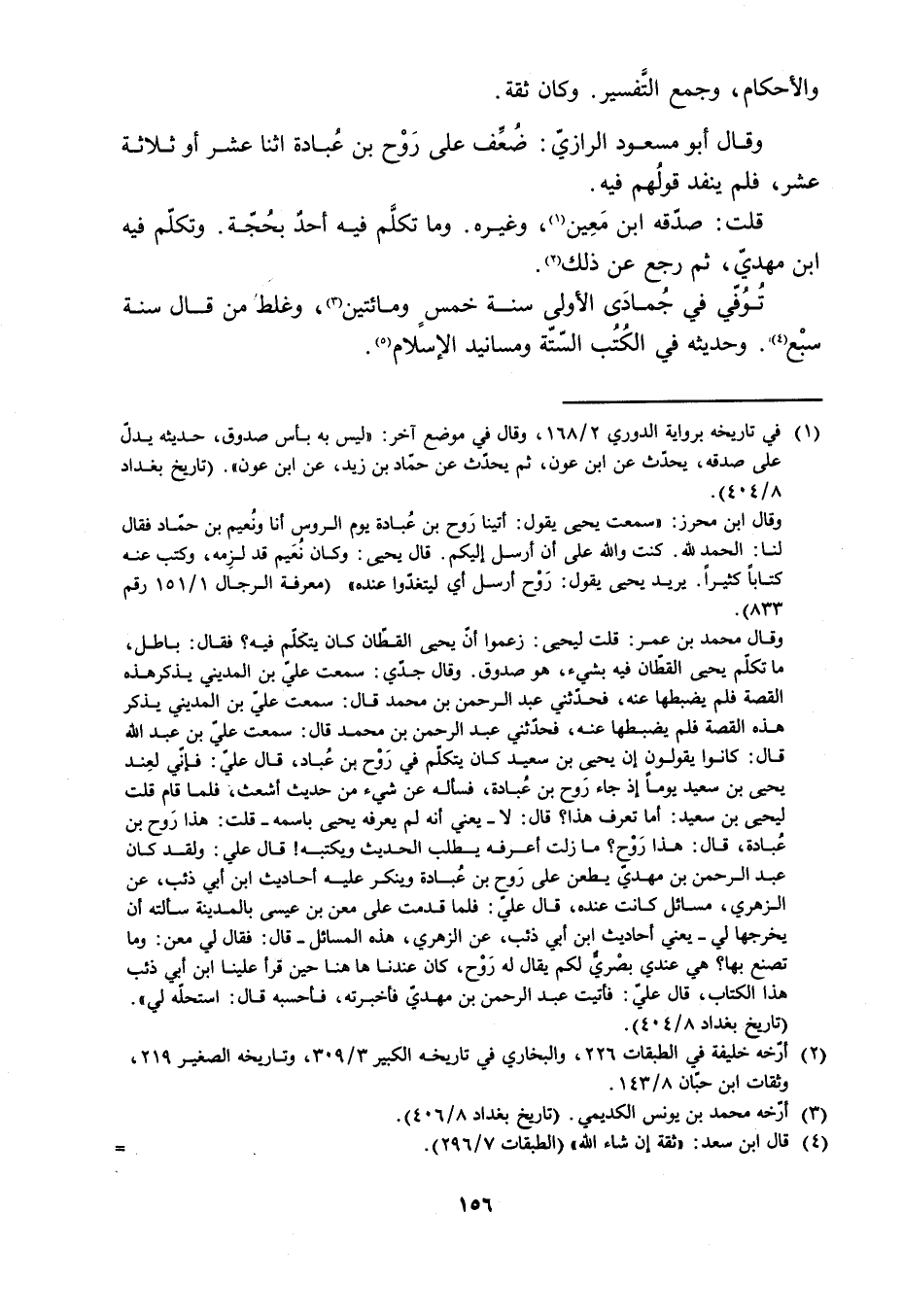 وقال محمد بن عمر: قلت ليحيى: زعموا أنّ يحيى القطّان كان يتكلّم فيه؟ فقال: باطل، ما تكلّم يحيى القطّان فيه بشيء، هو صدوق. وقال جدّي: سمعت عليّ بن المديني يذكر هذه القصة فلم يضبطها عنه، فحدّثني عبد الرحمن بن محمد قال: سمعت عليّ بن المديني يذكر هذه القصة فلم يضبطها عنه، فحدّثني عبد الرحمن بن محمد قال: سمعت عليّ بن عبد الله قال: كانوا يقولون إن يحيى بن سعيد كان يتكلّم في روح بن عباد، قال عليّ: فإنّي لعند يحيى بن سعيد يوما إذ جاء روح بن عبادة، فسأله عن شيء من حديث أشعث، فلما قام قلت ليحيى بن سعيد: أما تعرف هذا؟ قال: لا- يعني أنه لم يعرفه يحيى باسمه- قلت: هذا روح بن عبادة، قال: هذا روح؟ ما زلت أعرفه يطلب الحديث ويكتبه! قال علي: ولقد كان عبد الرحمن بن مهديّ يطعن على روح بن عبادة وينكر عليه أحاديث ابن أبي ذئب، عن الزهري، مسائل كانت عنده، قال عليّ: فلما قدمت على معن بن عيسى بالمدينة سألته أن يخرجها لي- يعني أحاديث ابن أبي ذئب، عن الزهري، هذه المسائل- قال: فقال لي معن: وما تصنع بها؟ هي عندي بصريّ لكم يقال له روح، كان عندنا ها هنا حين قرأ علينا ابن أبي ذئب هذا الكتاب، قال عليّ: فأتيت عبد الرحمن بن مهديّ فأخبرته، فأحسبه قال: استحلّه لي» .