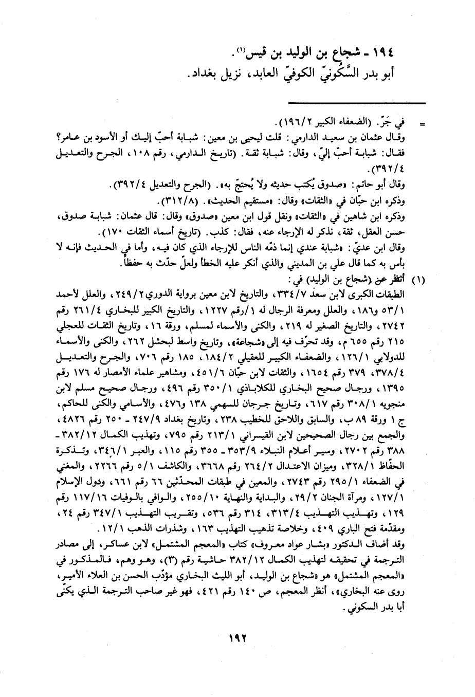 وقد أضاف الدكتور «بشار عواد معروف» كتاب «المعجم المشتمل» لابن عساكر، إلى مصادر الترجمة في تحقيقه لتهذيب الكمال 12/ 382 حاشية رقم (3) ، وهو وهم، فالمذكور في «المعجم المشتمل» هو «شجاع بن الوليد، أبو الليث البخاري مؤدّب الحسن بن العلاء الأمير، روى عنه البخاري» ، انظر المعجم، ص 140 رقم 421، فهو غير صاحب الترجمة الّذي يكنّى أبا بدر السكونيّ.