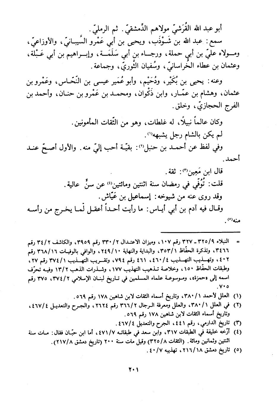 [4] أرّخه خليفة في الطبقات 317، وابن سعد في طبقاته 7/ 471، أما ابن حبّان فقال: مات سنة اثنتين وثمانين ومائة. (الثقات 8/ 325) وقيل مات سنة 200 (تاريخ دمشق 8/ 217) .