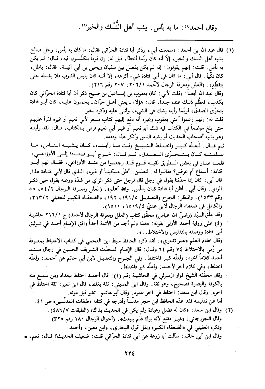 وقد علّق السيّد (رضي الله عنه) محقّق كتاب (العلل ومعرفة الرجال لأحمد) ج 1/ 216 حاشية (2) على رواية أحمد الأولى بقوله: «هذا ولم أجد من الأئمة أحدا وافق الإمام أحمد في توثيق أبي قتادة ووصفه بالتدليس والاختلاط..» .