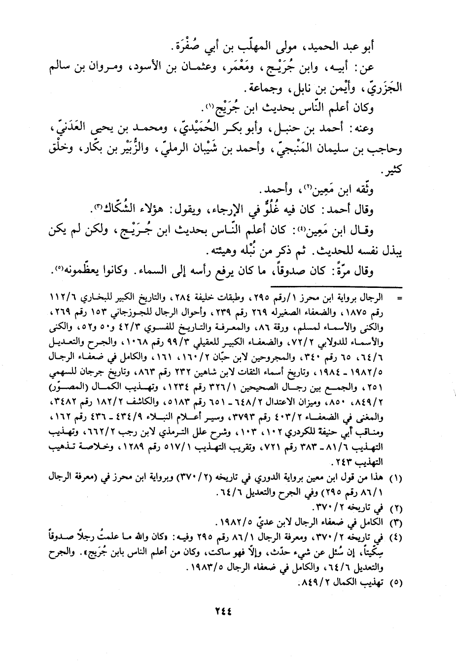 وقال ابن مَعِين [4] : كَانَ أعلم النّاس بحديث ابن جُرَيْج، ولكن لم يكن يبذل نفسه للحديث. ثمّ ذكر من نبله وهيئته.