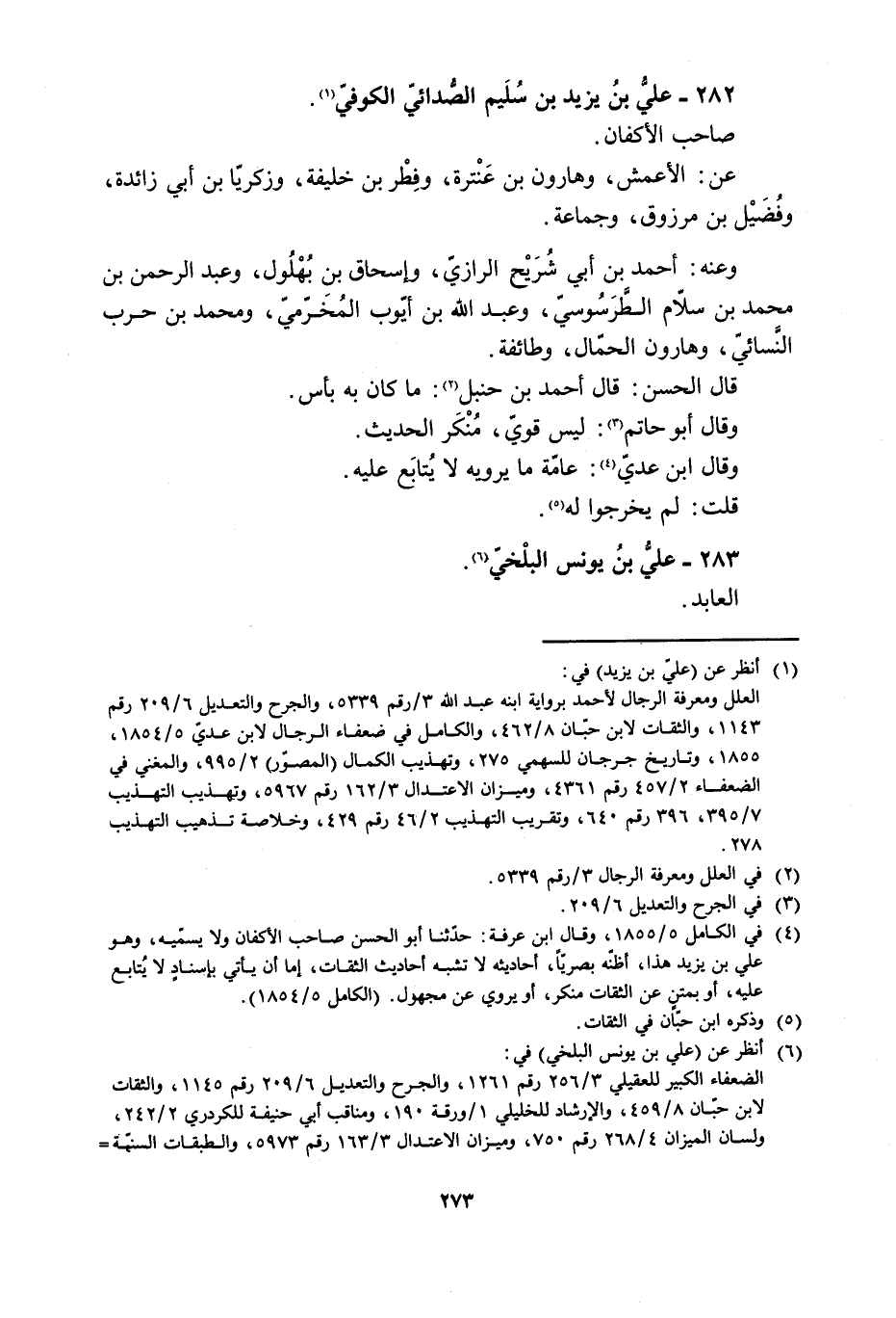 [4] في الكامل 5/ 1855، وقال ابن عرفة: حدّثنا أبو الحسن صاحب الأكفان ولا يسمّيه، وهو علي بن يزيد هذا، أظنّه بصريّا، أحاديثه لا تشبه أحاديث الثقات، إما أن يأتي بإسناد لا يتابع عليه، أو بمتن عن الثقات منكر، أو يروي عن مجهول. (الكامل 5/ 1854) .