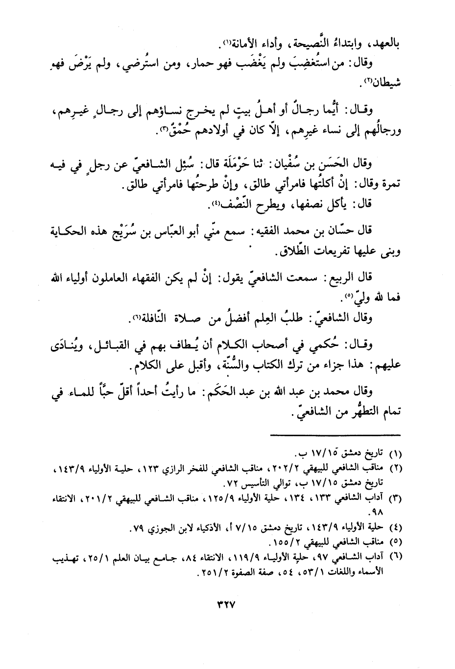 [6] آداب الشافعيّ 97، حلية الأولياء 9/ 119، الانتقاء 84، جامع بيان العلم 1/ 25، تهذيب الأسماء واللغات 1/ 53، 54، صفة الصفوة 2/ 251.