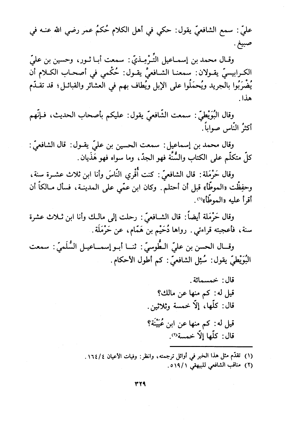 وقال الحَسَن بْن عليّ الطُّوسيّ: ثنا أبو إسماعيل السُّلَميّ: سَمِعْتُ البُوَيْطيّ يَقُولُ: سُئل الشافعيّ: كم أطول الأحكام.