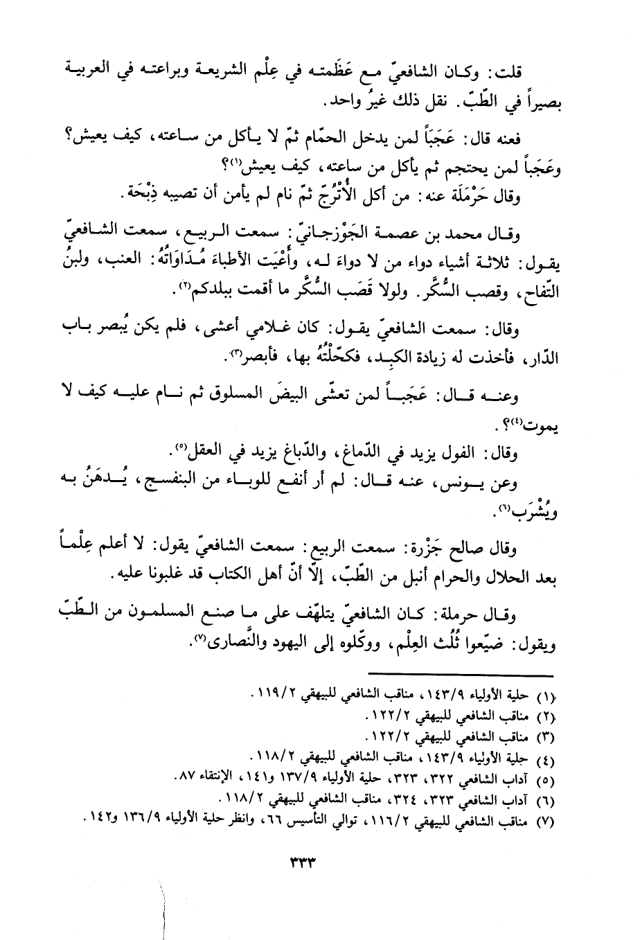 وقال حَرْمَلَة: كَانَ الشّافعيّ يتلهف على ما صنع المسلمون من الطّبّ ويقول: ضيعوا ثُلُث العِلْم، ووكّلوه إلى اليهود والنّصارى [7] .