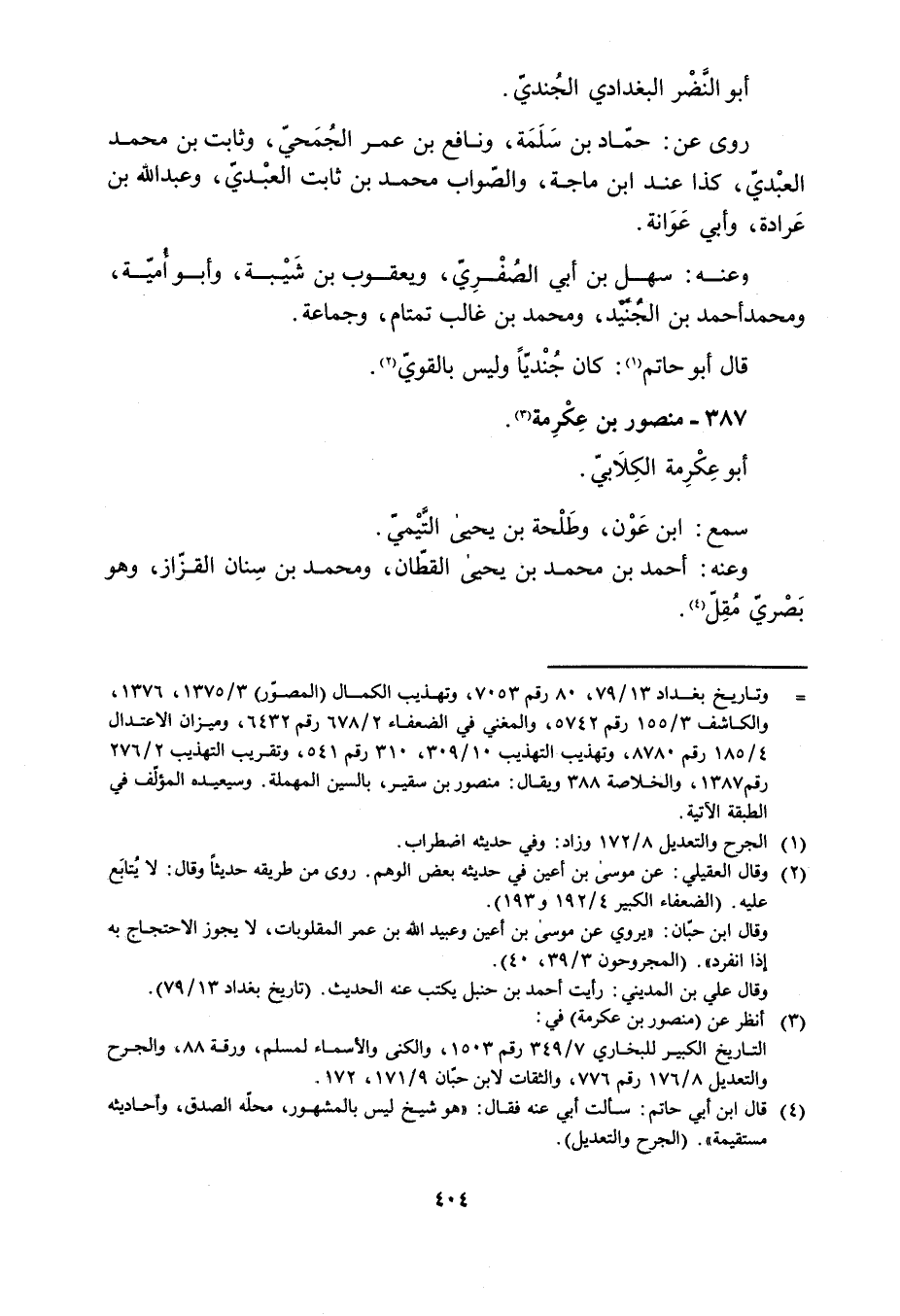 [ () ] وتاريخ بغداد 13/ 79، 80 رقم 7053، وتهذيب الكمال (المصوّر) 3/ 1375، 1376، والكاشف 3/ 155 رقم 5742، والمغني في الضعفاء 2/ 678 رقم 6432، وميزان الاعتدال 4/ 185 رقم 8780، وتهذيب التهذيب 10/ 309، 310 رقم 541، وتقريب التهذيب 2/ 276 رقم 1387، والخلاصة 388 ويقال: منصور بن سقير، بالسين المهملة. وسيعيده المؤلف في الطبقة الآتية.