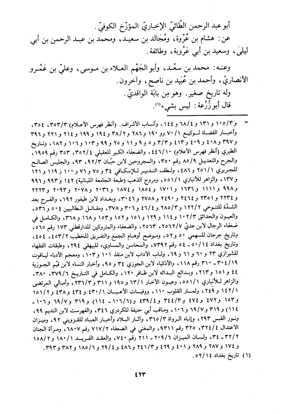[ () ] و 3/ 105 و 131 و 4/ 68 و 144، وأنساب الأشراف. (انظر فهرس الأعلام) 3/ 353، 354، وأخبار القضاة لوكيع 1/ 70 و 190 و 286 و 2/ 38 و 194 و 199 و 214 و 221 و 396 و 397 و 408 و 409 و 413 و 3/ 3 و 5 و 9 و 11 و 25 و 99 و 103 و 106 و 182، وتاريخ الطبري (انظر فهرس الأعلام) 10/ 446، والضعفاء الكبير للعقيليّ 4/ 352، 353 رقم 1959، والجرح والتعديل 9/ 85 رقم 350، والمجروحين لابن حبّان 3/ 92، 93، والجليس الصالح للجريري 1/ 251 و 486، ولطف التدبير للإسكافي 34 و 75 و 76 و 100 و 119 و 121 و 137، والزاهر للأنباري 1/ 551، ومروج الذهب (طبعة الجامعة اللبنانية) 142 و 993 و 996 و 998 و 1111 و 1636 و 1701 و 1854 و 1874 و 2036 و 2078 و 2093 و 2223 و 2234 و 2351 و 2464 و 2490 و 2758 و 3046، وبغداد لابن طيفور 192، والفرج بعد الشدّة للتنوخي 2/ 122 و 3/ 285 و 4/ 46 و 306 و 378، ومقاتل الطالبيين 504 و 536، والعيون والحدائق 3/ 102 و 114 و 129 و 151 و 152 و 153 و 168 و 368، والكامل في ضعفاء الرجال لابن عديّ 7/ 2562، 2563، والضعفاء والمتروكين للدار للدّارقطنيّ 173 رقم 565، وتاريخ جرجان للسهمي 50 و 52، وموضح أوهام الجمع والتفريق للخطيب 2/ 453، 454، وتاريخ بغداد 14/ 50- 54 رقم 7392، والمحاسن والمساوئ للبيهقي 294، وطبقات الفقهاء للشيرازي 23 و 60 و 61 و 69، ولباب الآداب لابن منقذ 101 و 103، ومعجم الأدباء لياقوت 19/ 304- 310 رقم 118، والأذكياء لابن الجوزي 34 و 95، وأخبار النساء لابن قيّم الجوزية 44 و 151 و 213، وبدائع البدائه لابن ظافر 120، والكامل في التاريخ 6/ 379، 380، والزاهر للأنباري 1/ 551، وعيون الأخبار 1/ 63 و 195 و 311 و 3/ 236، وأمالي المرتضى 1/ 142 و 249، وثمار القلوب 110، ووفيات الأعيان 1/ 430 و 434 و 438 و 2/ 151 و 153 و 472 و 474 و 3/ 344 و 4/ 439 و (6/ 106- 114) و 319 و 7/ 69 و 106- 114) و 319 و 7/ 69 و 106، ومناقب أبي حنيفة للكردري 346، والفهرست لابن النديم 99، ونور القبس 293، وإنباه الرواة 3/ 365، وآثار البلاد وأخبار العباد للقزويني 92، وميزان الاعتدال 4/ 324، 325 رقم 9311، والمغني في الضعفاء 2/ 717 رقم 6807، ومرآة الجنان 2/ 32- 34، ولسان الميزان 6/ 209- 211 رقم 740، والعقد الفريد 1/ 180 و 2/ 158 و 174 و 287 و 289 و 401 و 429 و 3/ 241 و 486 و 4/ 29 و 6/ 185 و 382 و 393.