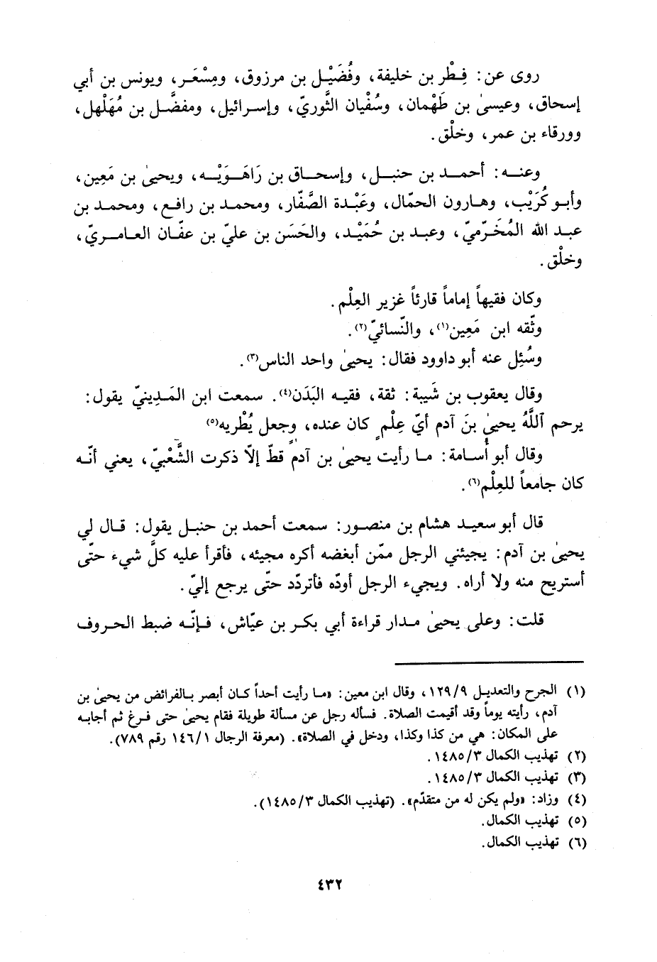 [1] الجرح والتعديل 9/ 129، وقال ابن معين: «ما رأيت أحدا كان أبصر بالفرائض من يحيى بن آدم، رأيته يوما وقد أقيمت الصلاة. فسأله رجل عن مسألة طويلة فقام يحيى حتى فرغ ثم أجابه على المكان: هي من كذا وكذا، ودخل في الصلاة» . (معرفة الرجال 1/ 146 رقم 789) .