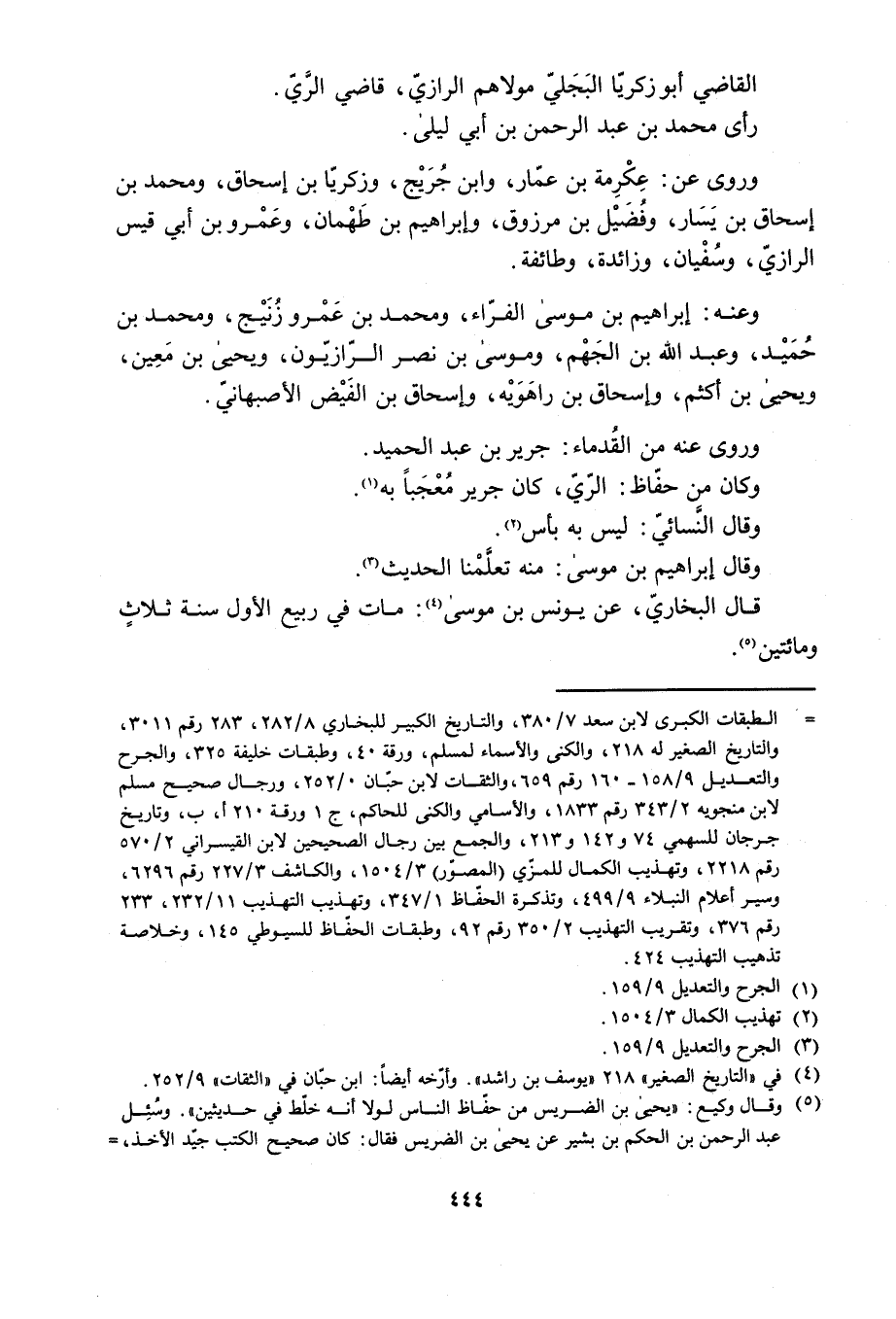 [ () ] الطبقات الكبرى لابن سعد 7/ 380، والتاريخ الكبير للبخاريّ 8/ 282، 283 رقم 3011، والتاريخ الصغير له 218، والكنى والأسماء، لمسلم، ورقة 40، وطبقات خليفة 325، والجرح والتعديل 9/ 158- 160 رقم 659، والثقات لابن حبّان 0/ 252، ورجال صحيح مسلم لابن منجويه 2/ 343 رقم 1833، والأسامي والكنى للحاكم، ج 1 ورقة 210 أ، ب، وتاريخ جرجان للسهمي 74 و 142 و 213، والجمع بين رجال الصحيحين لابن القيسراني 2/ 570 رقم 2218، وتهذيب الكمال للمزّي (المصوّر) 3/ 1504، والكاشف 3/ 227 رقم 6296، وسير أعلام النبلاء 9/ 499، وتذكرة الحفّاظ 1/ 347، وتهذيب التهذيب 11/ 232، 233 رقم 376، وتقريب التهذيب 2/ 350 رقم 92، وطبقات الحفّاظ للسيوطي 145، وخلاصة تذهيب التهذيب 424.