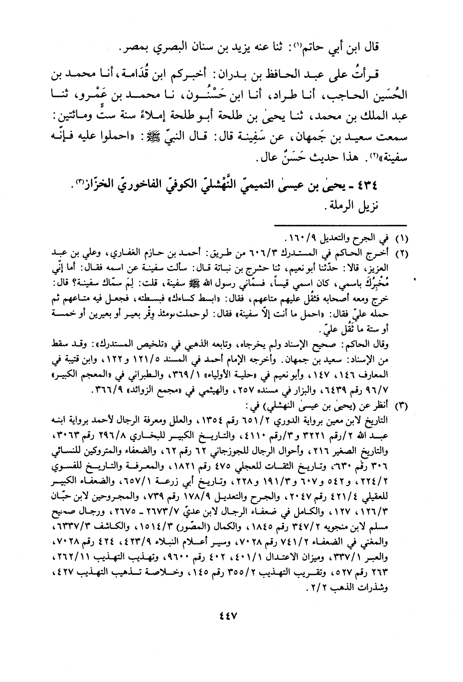 سَمِعْتُ سَعِيدِ بْنِ جُمْهَانَ، عَنْ سَفِينَةَ قَالَ: قَالَ النَّبِيُّ صَلَّى اللَّهُ عَلَيْهِ وَسَلَّمَ: «احْمِلُوا عَلَيْهِ فَإِنَّهُ سَفِينَةُ» [2] . هَذَا حَدِيثٌ حَسَنٌ عَالٍ.