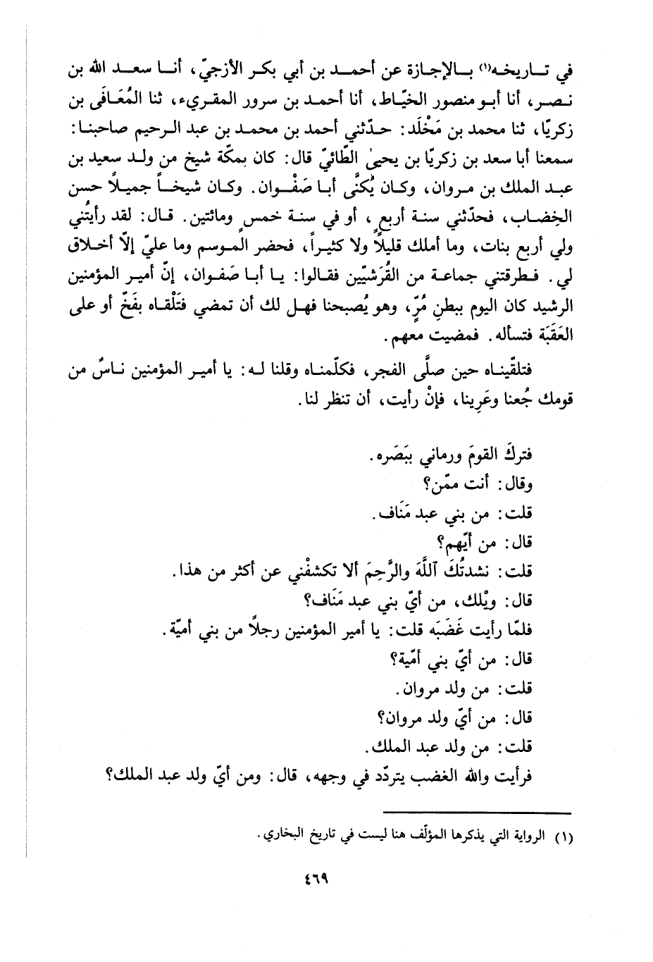 سمعنا أبا سعْد بْن زكريّا بْن يحيى الطّائيّ قَالَ: كَانَ بمكّة شيخ من وُلِد سَعِيد بْن عَبْد الملك بْن مروان، وكان يكنى أبا صَفْوان. وكان شيخًا جميلًا حَسَن الخِضاب، فحدّثني سنة أربعٍ، أو في سنة خمس ومائتين. قَالَ: لقد رأيتُني ولي أربع بنات، وما أملك قليلًا ولا كثيرًا، فحضر الموسم وما عليّ إلّا أخلاق لي. فطرقتني جماعة من القُرَشيّين فقالوا: يا أبا صَفْوان، إنّ أمير المؤمنين الرشيد كان اليوم ببطن مرّ، وهو يصبحنا فهل لك أنّ تمضي فتلقاه بفَخّ أو عَلَى العقبة فتسأله. فمضيت معهم.