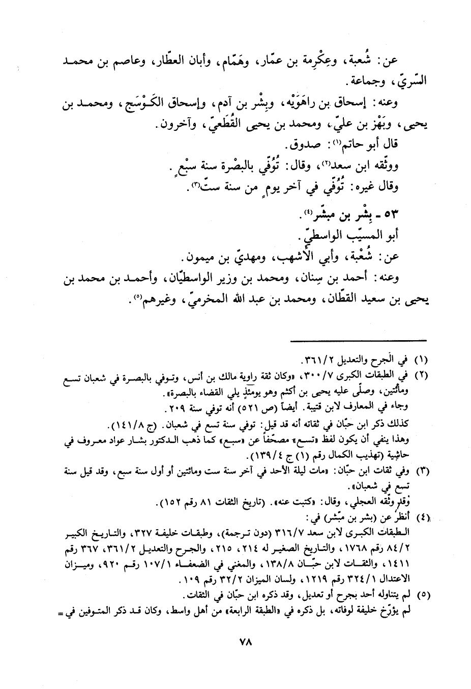 [2] في الطبقات الكبرى 7/ 300، «وكان ثقة راوية مالك بن أنس، وتوفي بالبصرة في شعبان تسع ومائتين، وصلّى عليه يحيى بن أكثم وهو يومئذ يلي القضاء بالبصرة» .