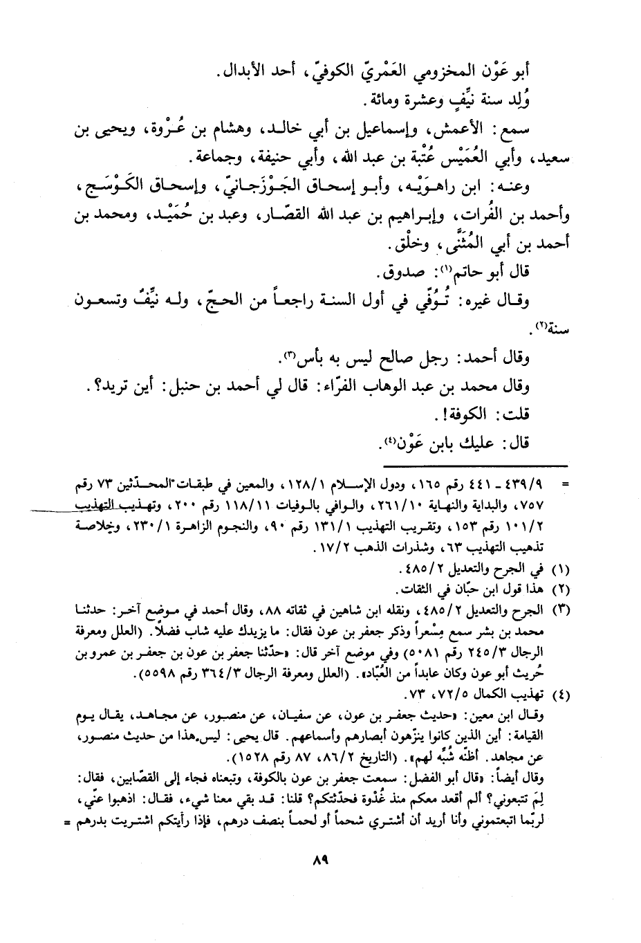 [3] الجرح والتعديل 2/ 485، ونقله ابن شاهين في ثقاته 88، وقال أحمد في موضع آخر: حدثنا محمد بن بشر سمع مسعرا وذكر جعفر بن عون فقال: ما يزيدك عليه شاب فضلا. (العلل ومعرفة الرجال 3/ 245 رقم 5081) وفي موضع آخر قال: «حدّثنا جعفر بْن عَون بْن جَعْفَرُ بْنُ عَمْرِو بْنِ حُرَيْثٍ أَبُو عَوْنٍ وكان عابدا من العبّاد» . (العلل ومعرفة الرجال 3/ 364 رقم 5598) .